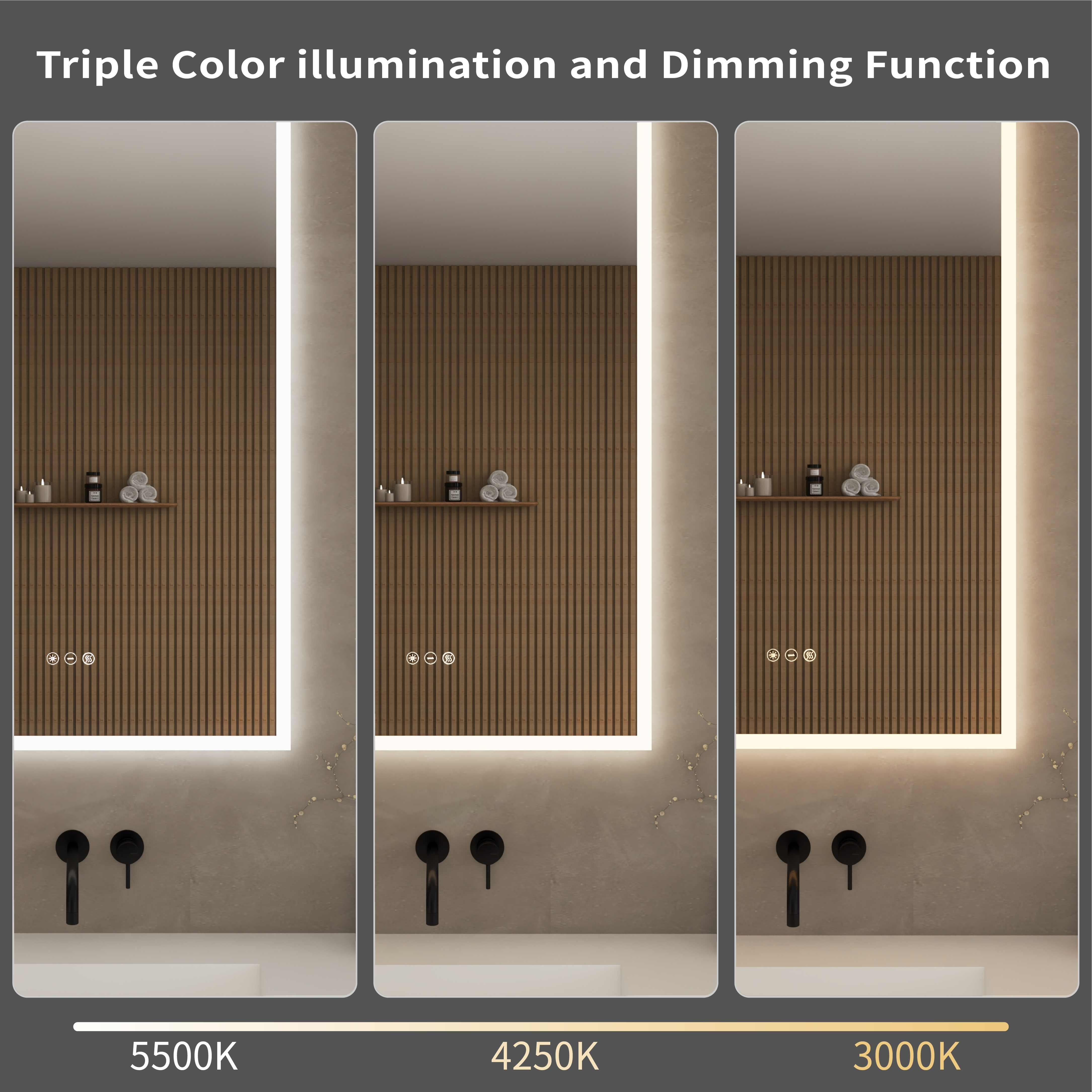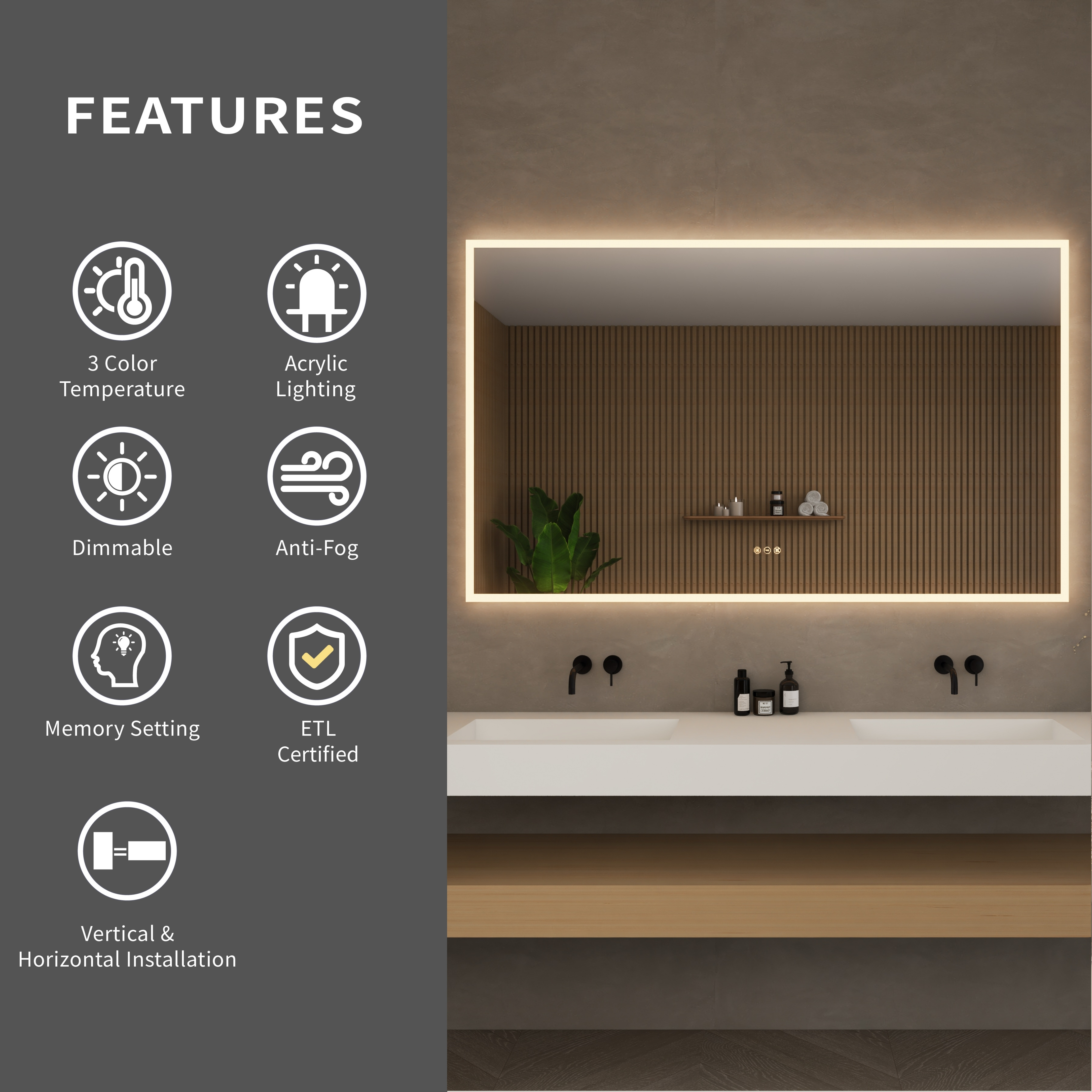 The Element LED Mirror Collection by Wyndham Collection elevates bathroom design with a perfect balance of function and style. Included in all sizes of the Element collection are adjustable color temperature ranging from 3000K to 5500K, allowing users to create the ideal lighting for any task or mood. Built-in dimming capabilities provide further control over brightness, while the integrated defogger ensures a clear reflection even after the hottest showers. Designed with a sleek all-around acrylic frame, the Element Collection not only enhances modern aesthetics but also maximizes light output and distribution, producing an optimal glow that transforms any bathroom into a well-lit space.