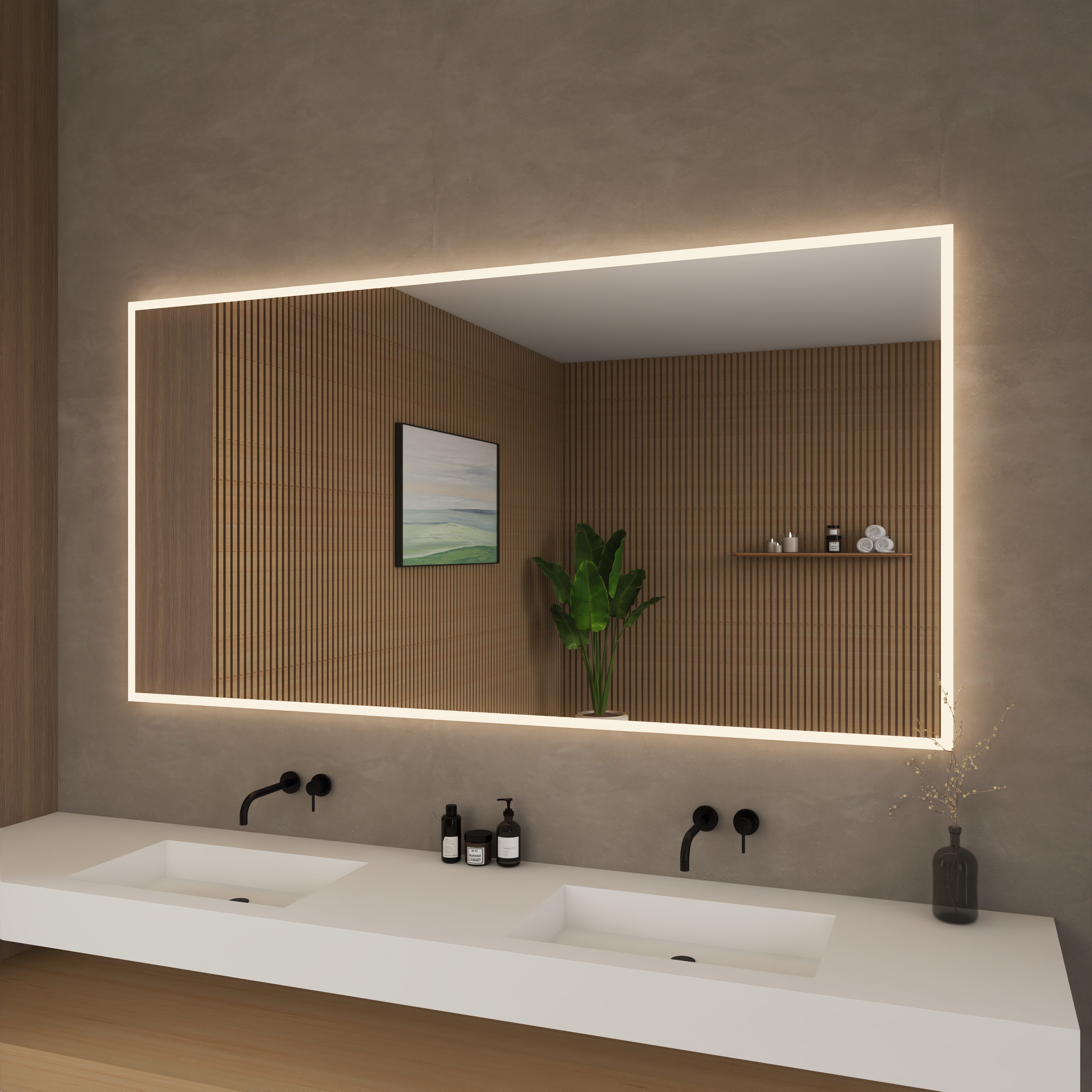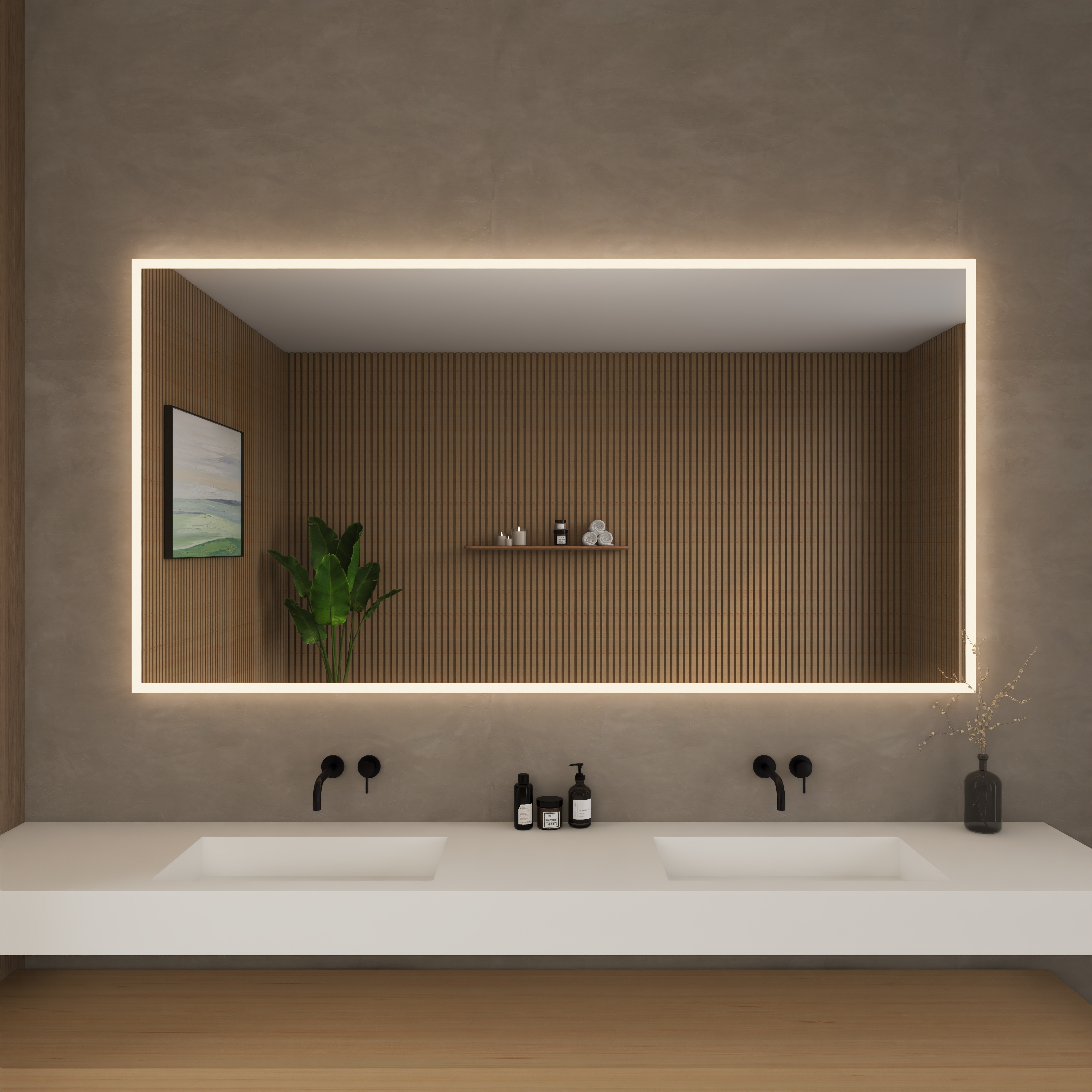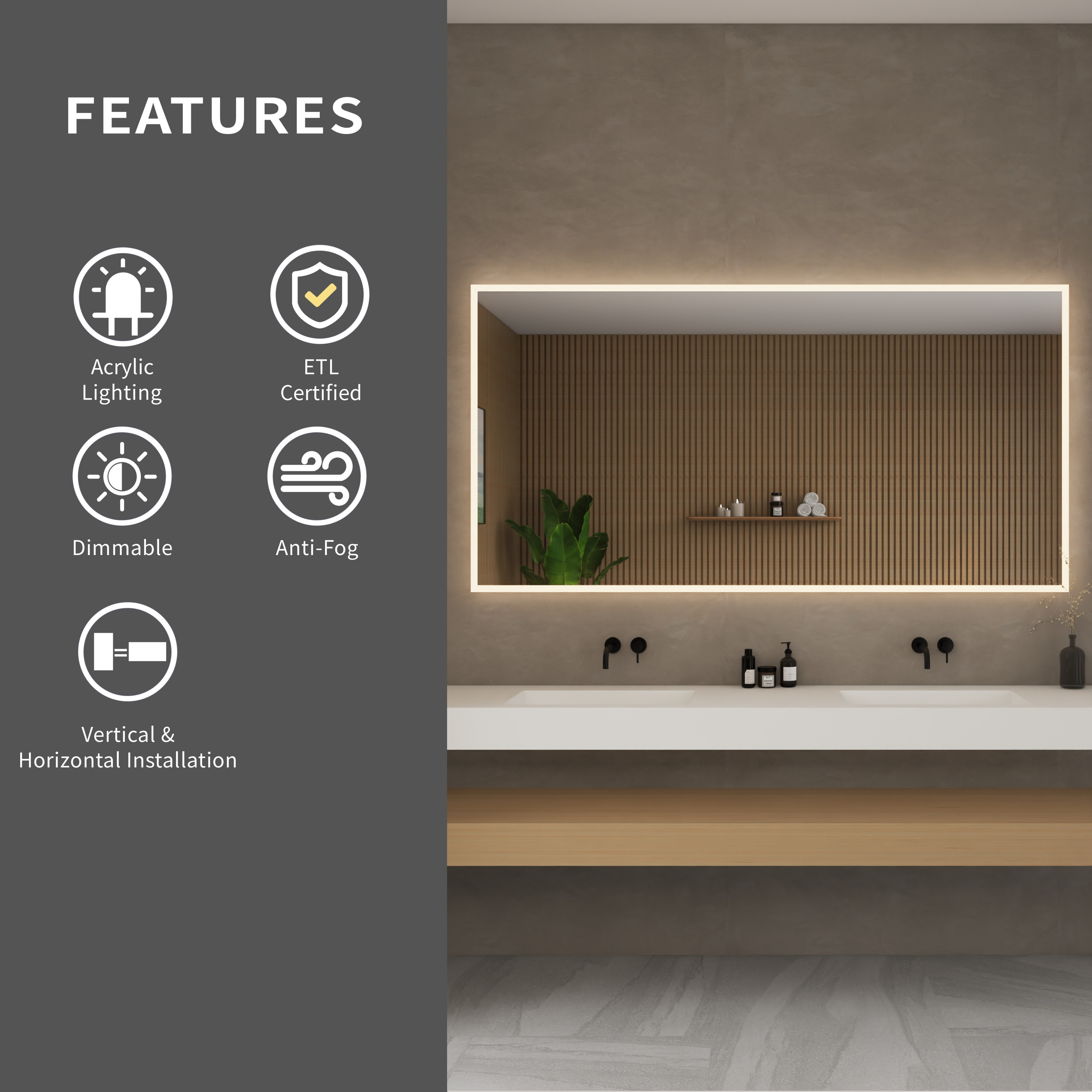 The Hilton LED Mirror Collection by Wyndham Collection delivers a refined balance of functionality and atmosphere, making it a standout choice for modern bathrooms. Similar to the Carlton Collection, built without a touch sensor button, the Hilton Collection sets itself apart with a perimeter-style light that creates a soft, ambient glow across the vanity area. This elegant halo of illumination enhances both task lighting and overall bathroom ambiance, perfect for daily routines or relaxing evenings. With a built-in dimmer for adjustable brightness and an integrated defogger to maintain a crystal-clear reflection, the Hilton Collection is the ideal solution for customers seeking both practicality and sophisticated design in their bathroom mirror.