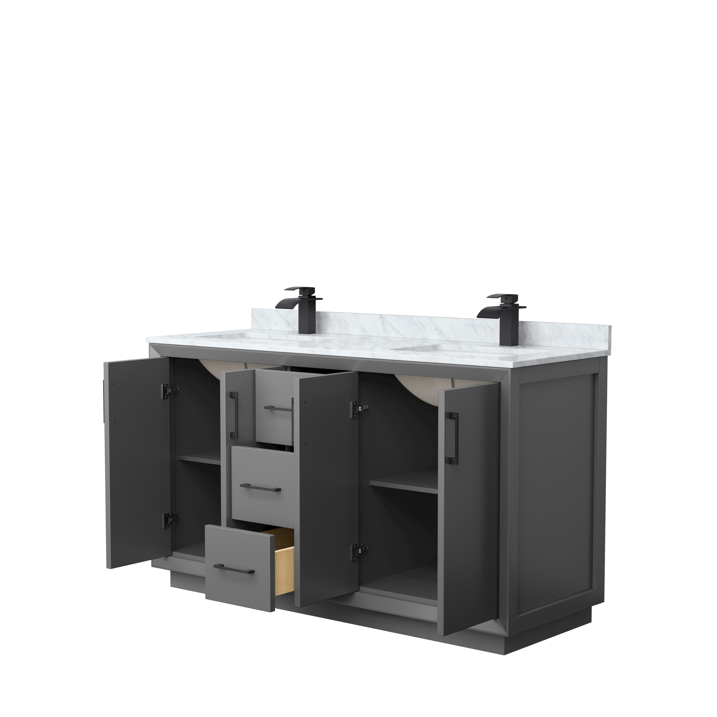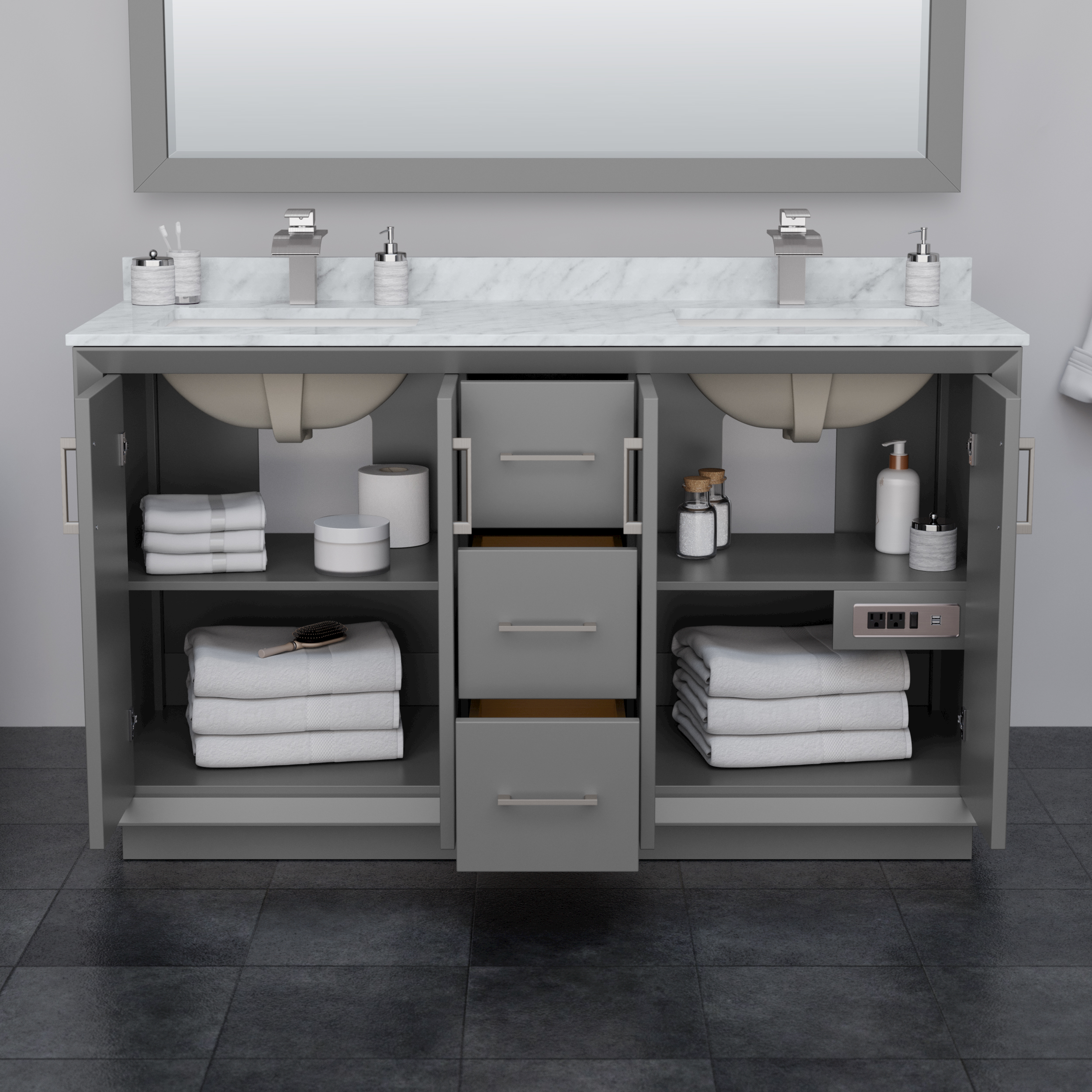 Perfect for a modern update, the Strada bathroom vanity features clean and understated contemporary lines that highlight the elegance and simplicity of this transitional vanity by Wyndham Collection. It comes well equipped with soft-close doors and drawers, ample storage space, 110V power and USB outlets, adjustable shelves, and a cutout back for easy access to plumbing and electrical.
