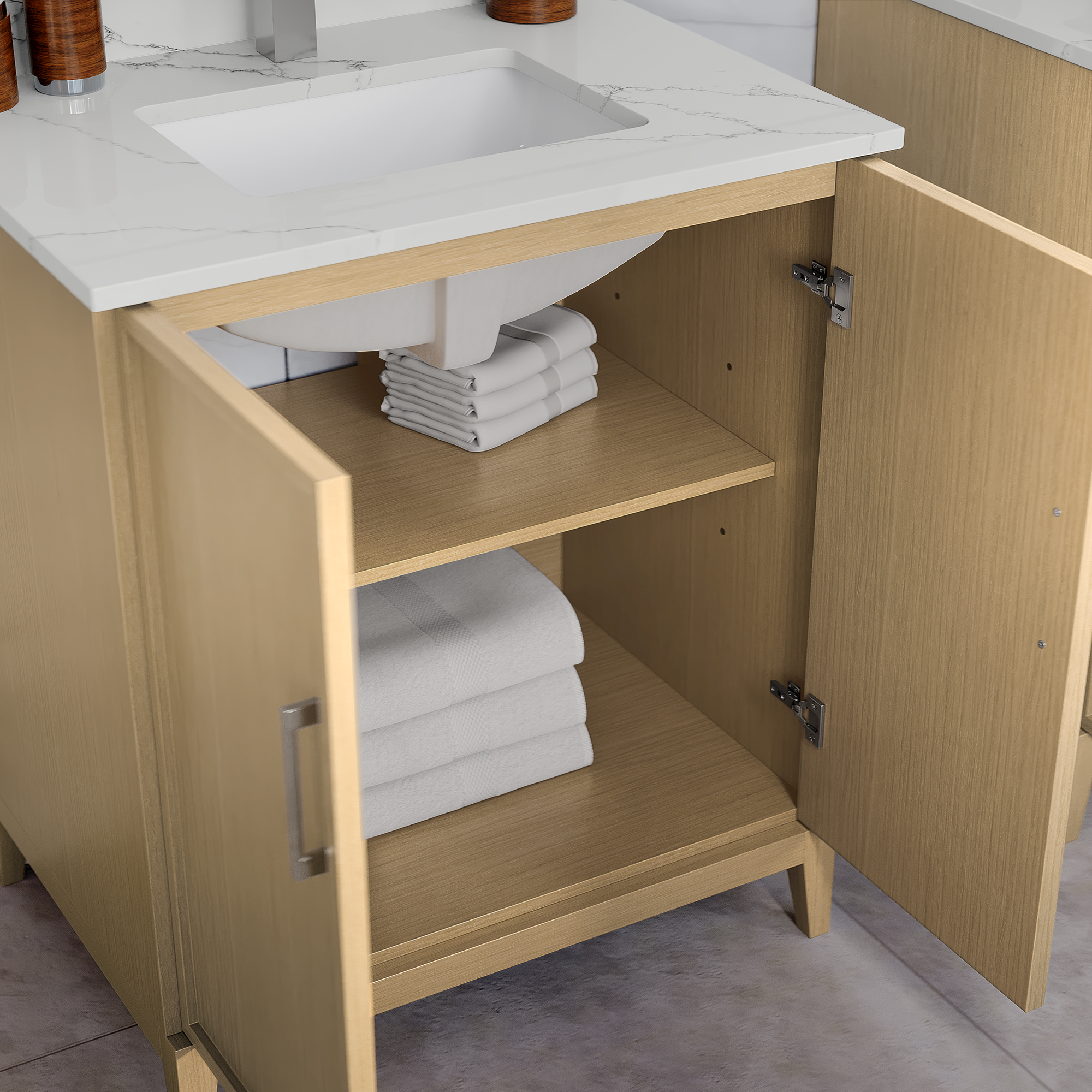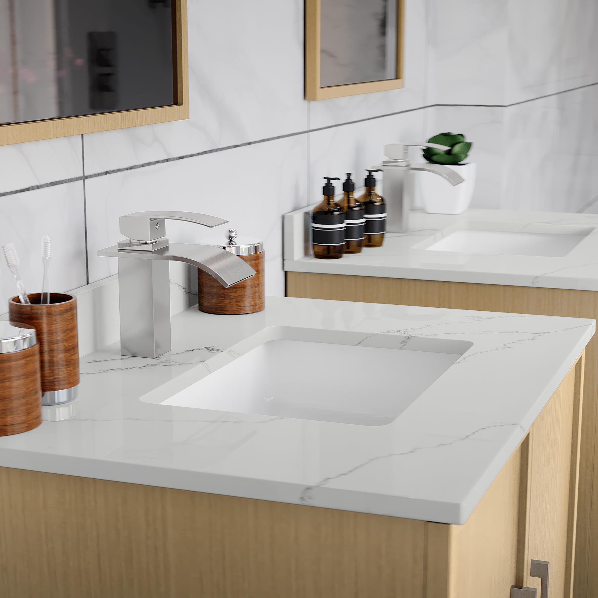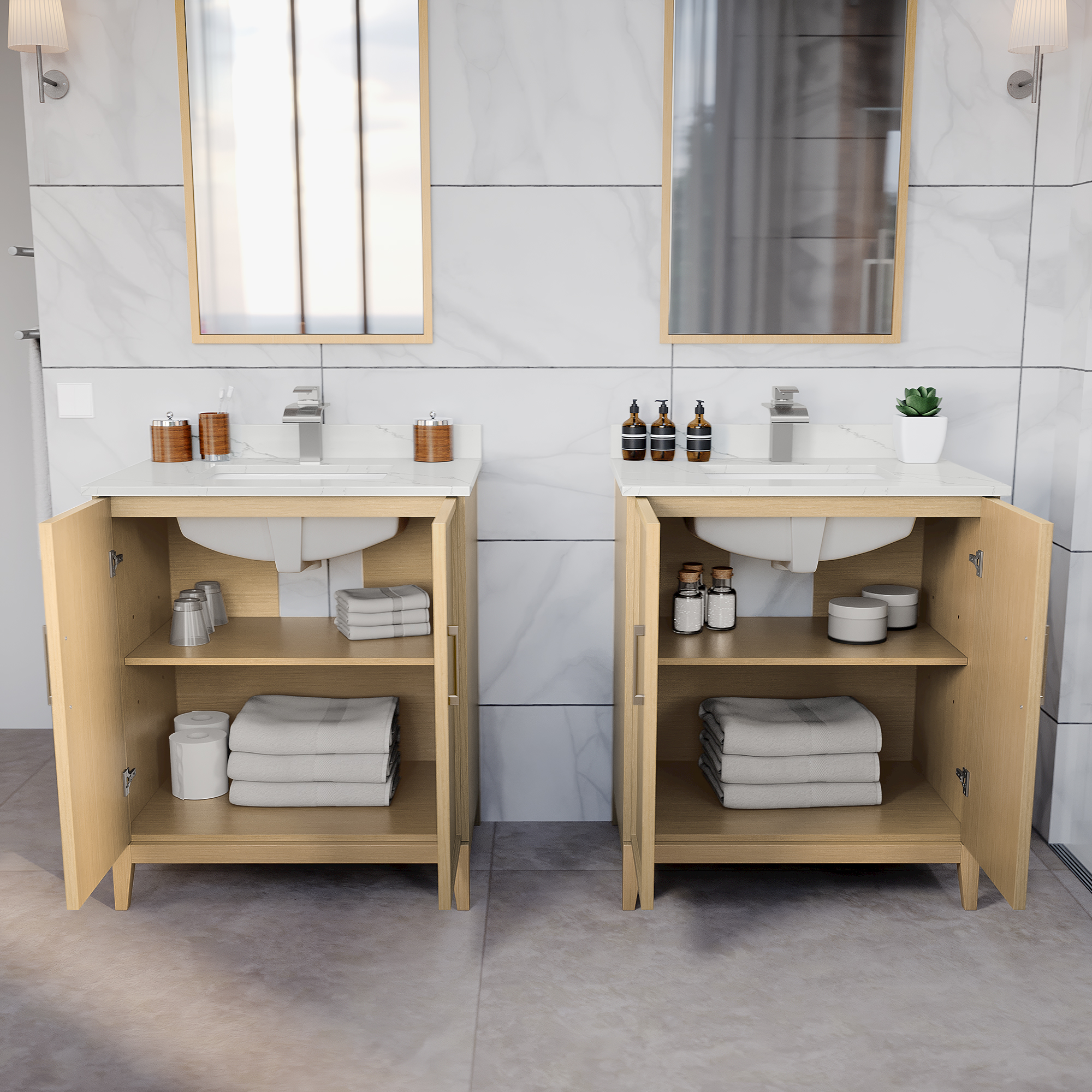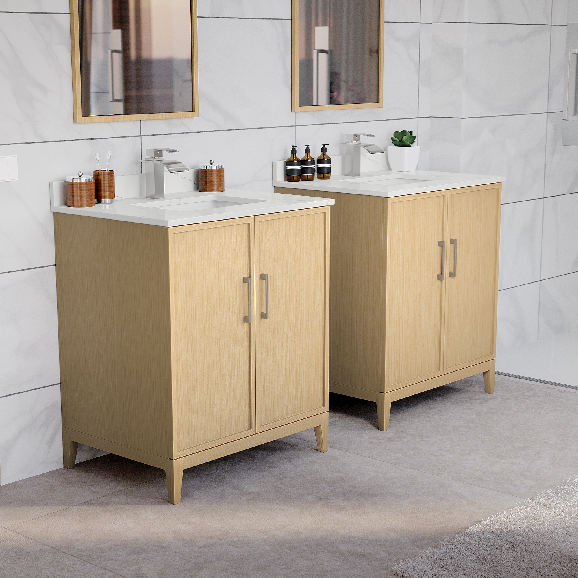 This transitional bathroom vanity exudes sleek sophistication with its clean lines and minimalist slim shaker design. The Elan vanity is crafted from high-quality materials like solid wood and plywood, with counters in multiple material options. Quartz and cultured stone counters include a back-and side-splash. Finished painted or in rift-cut white oak veneer, it seamlessly combines beauty and real-life usefulness. Its integrated, soft-closing drawers (featuring 3D adjustable glides) and doors offer ample storage space for toiletries, towels, and other essentials, keeping the space clutter-free. The sleek, angular hardware contributes to the overall aesthetic, creating a stylish focal point in the bathroom. Elevate your bathroom haven without compromising form or function.