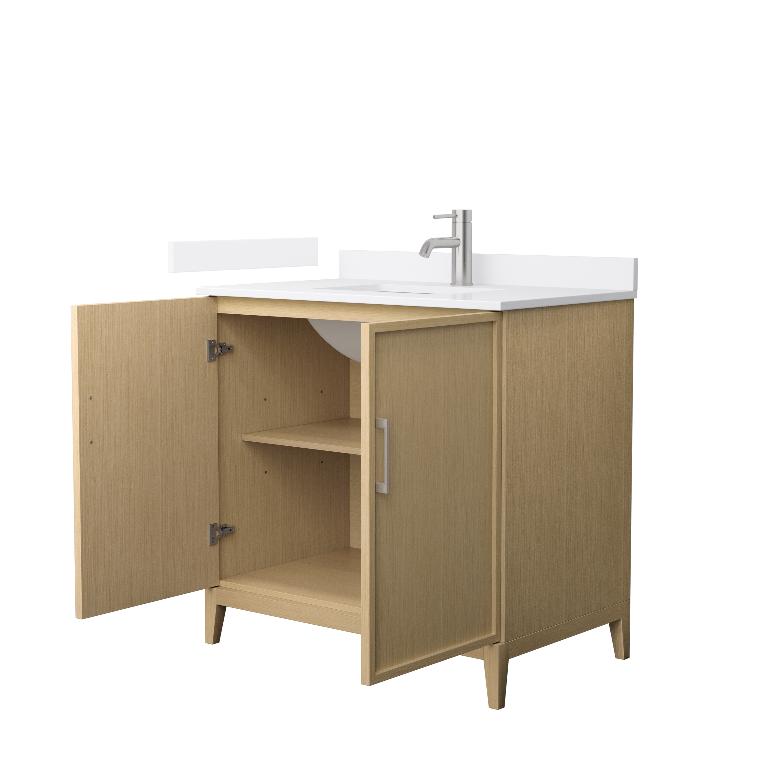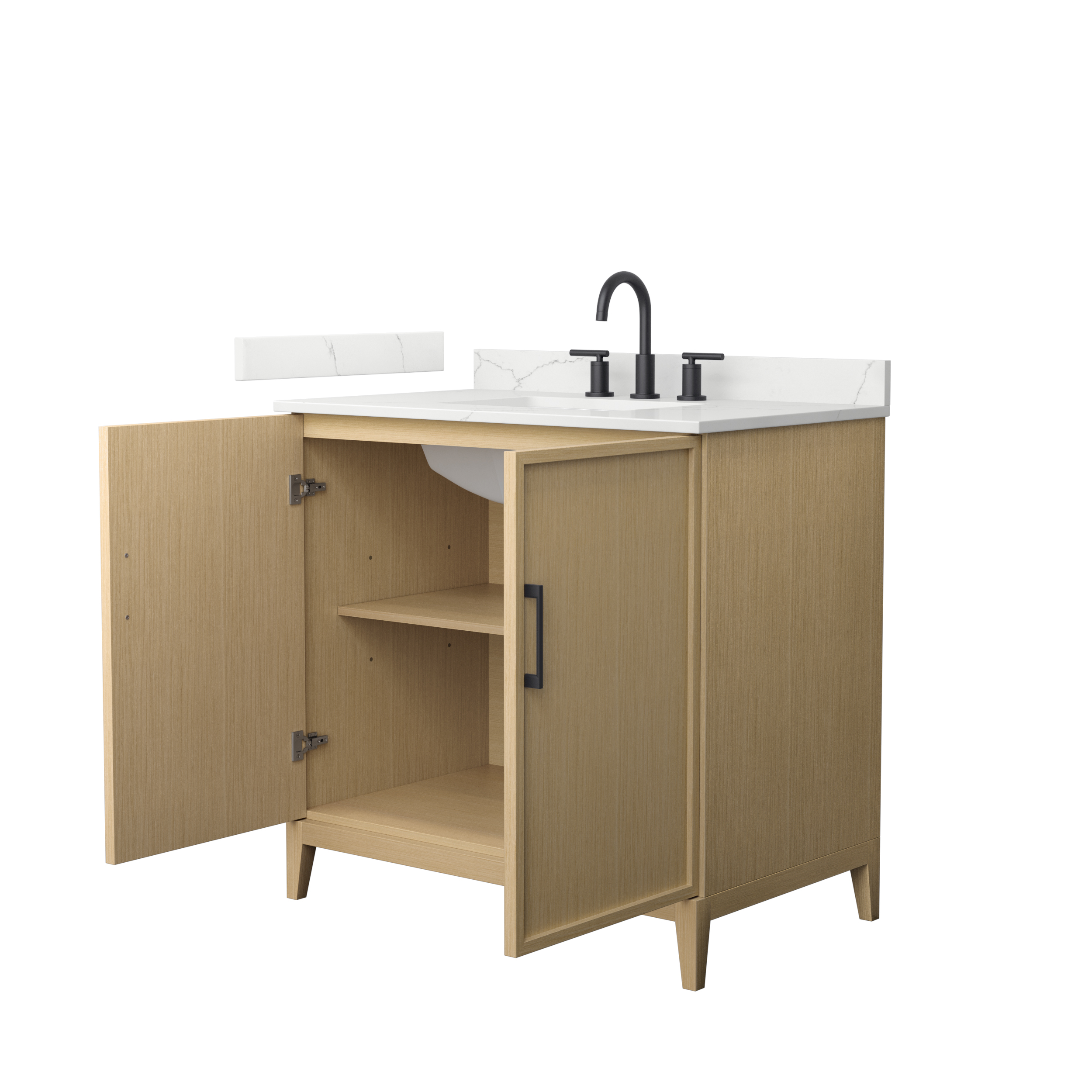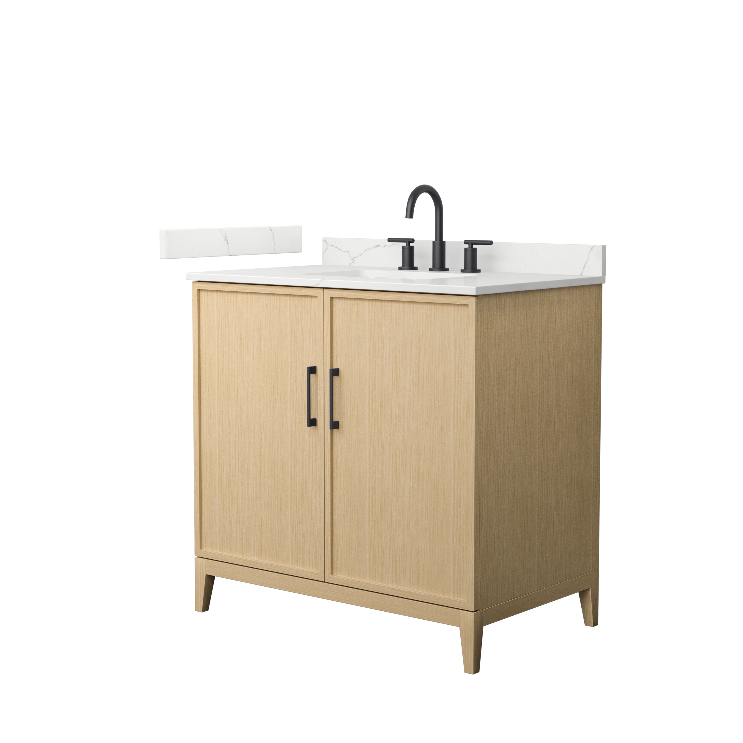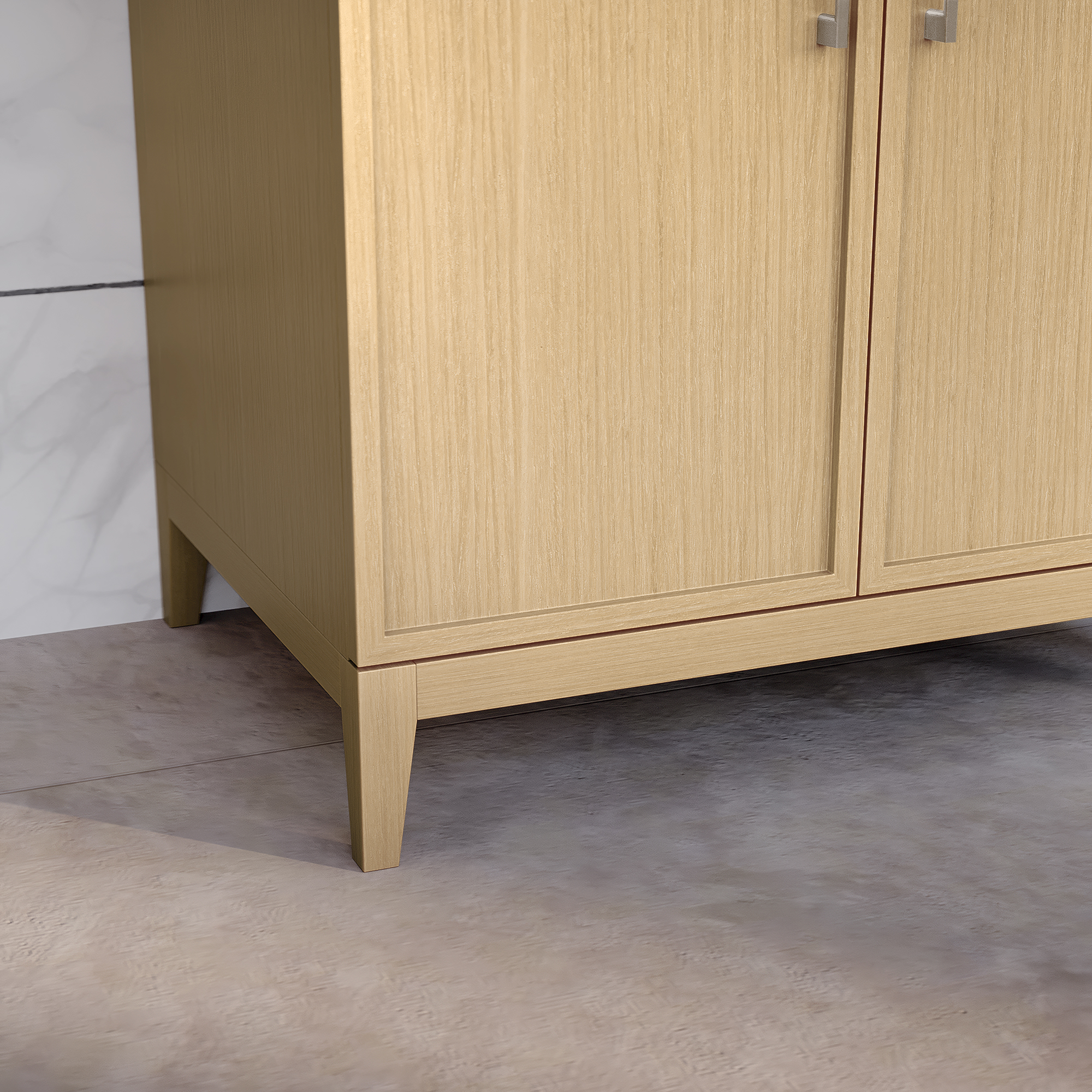 This transitional bathroom vanity exudes sleek sophistication with its clean lines and minimalist slim shaker design. The Elan vanity is crafted from high-quality materials like solid wood and plywood, with counters in multiple material options. Quartz and cultured stone counters include a back-and side-splash. Finished painted or in rift-cut white oak veneer, it seamlessly combines beauty and real-life usefulness. Its integrated, soft-closing drawers (featuring 3D adjustable glides) and doors offer ample storage space for toiletries, towels, and other essentials, keeping the space clutter-free. The sleek, angular hardware contributes to the overall aesthetic, creating a stylish focal point in the bathroom. Elevate your bathroom haven without compromising form or function.