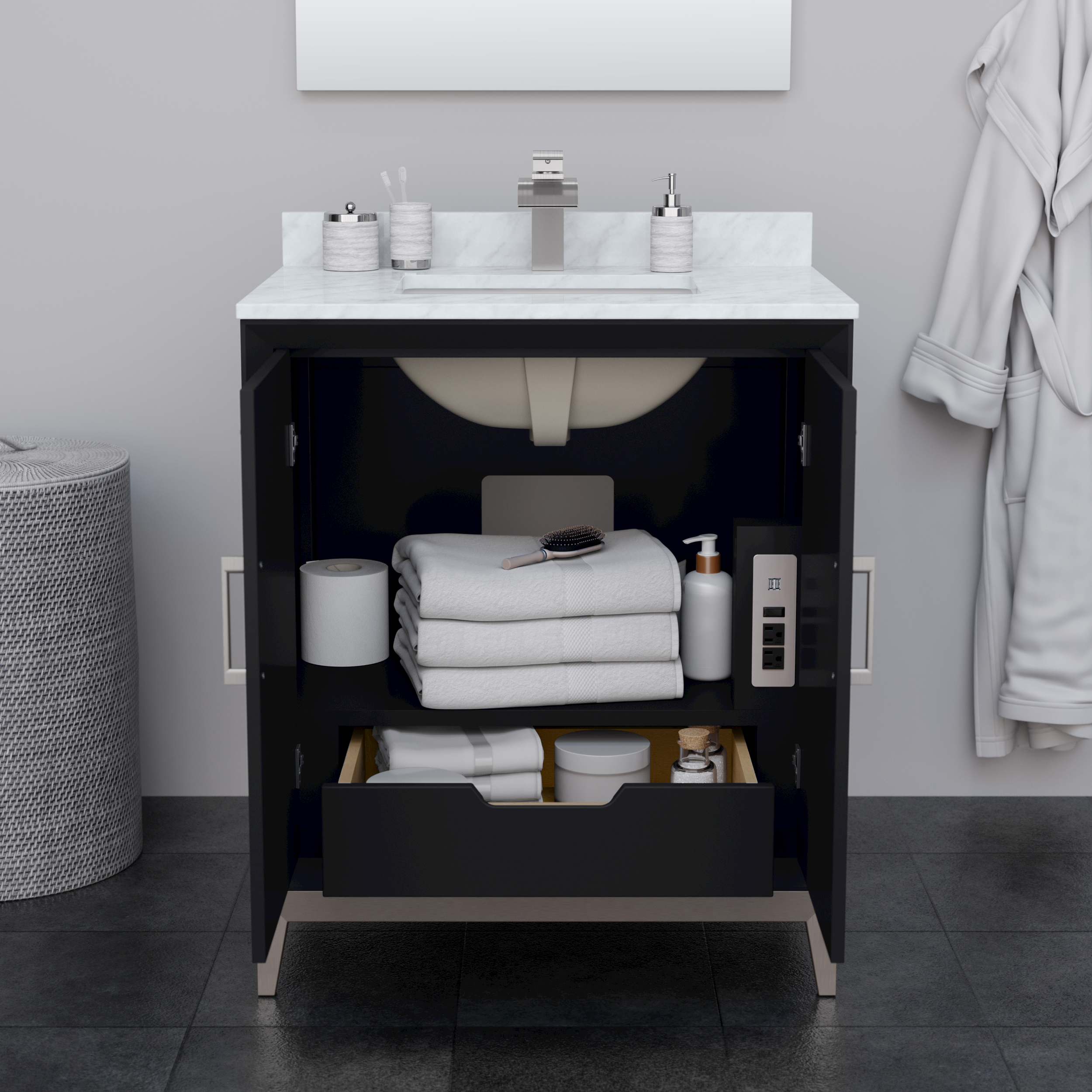 Classic luxurious elegance with clean and contemporary styling are the hallmarks of the beautiful Marlena vanity collection, perfect for most home decors. Offered in a range of sizes, cabinet colors and metal trim colors, you're sure to find the perfect fit. There's plenty of storage space, soft-close doors and drawers, internal drawers and the convenience of a 110v outlet and USB charger just inside the door. Offered with available Quartz, Carrara Marble, or Cultured Stone counters.