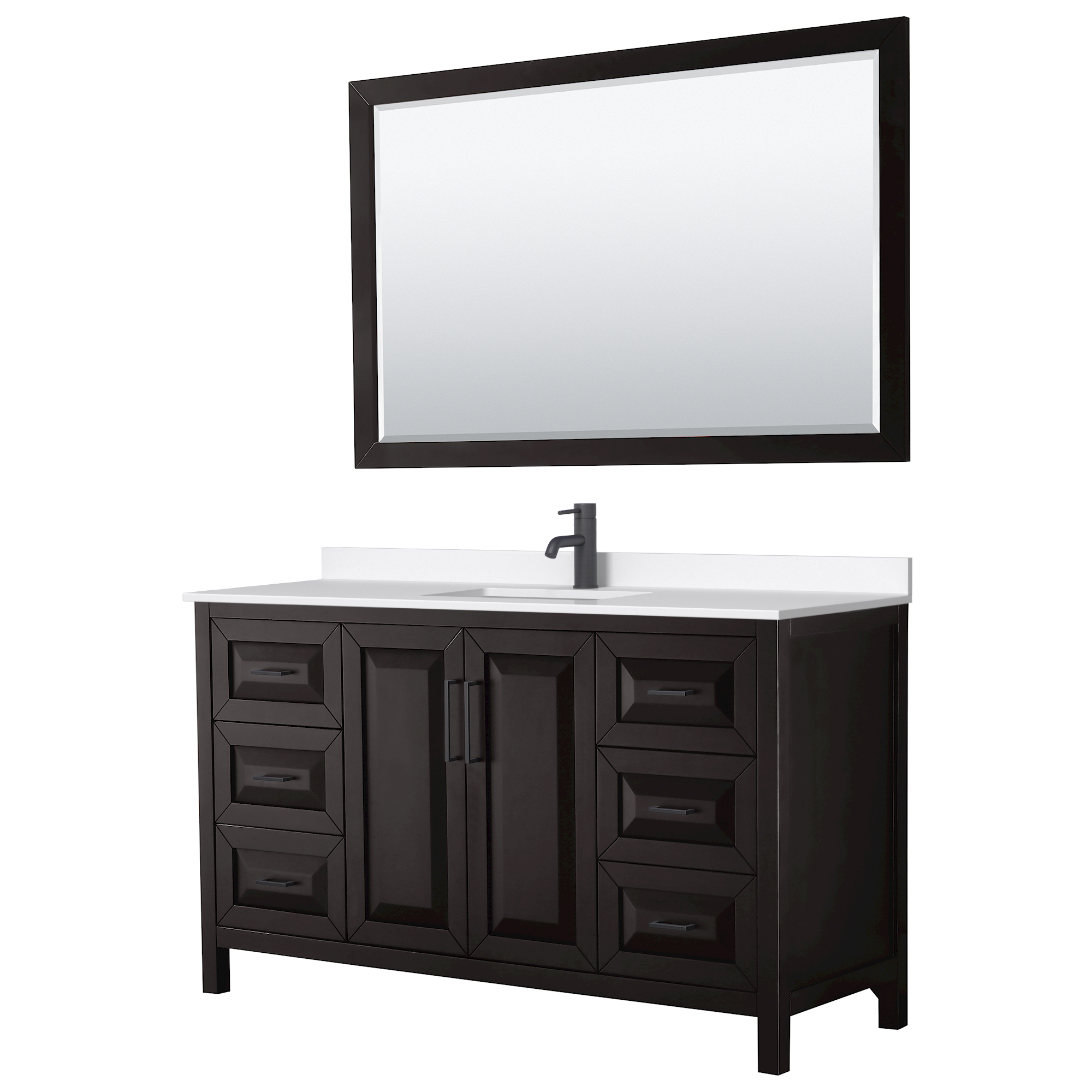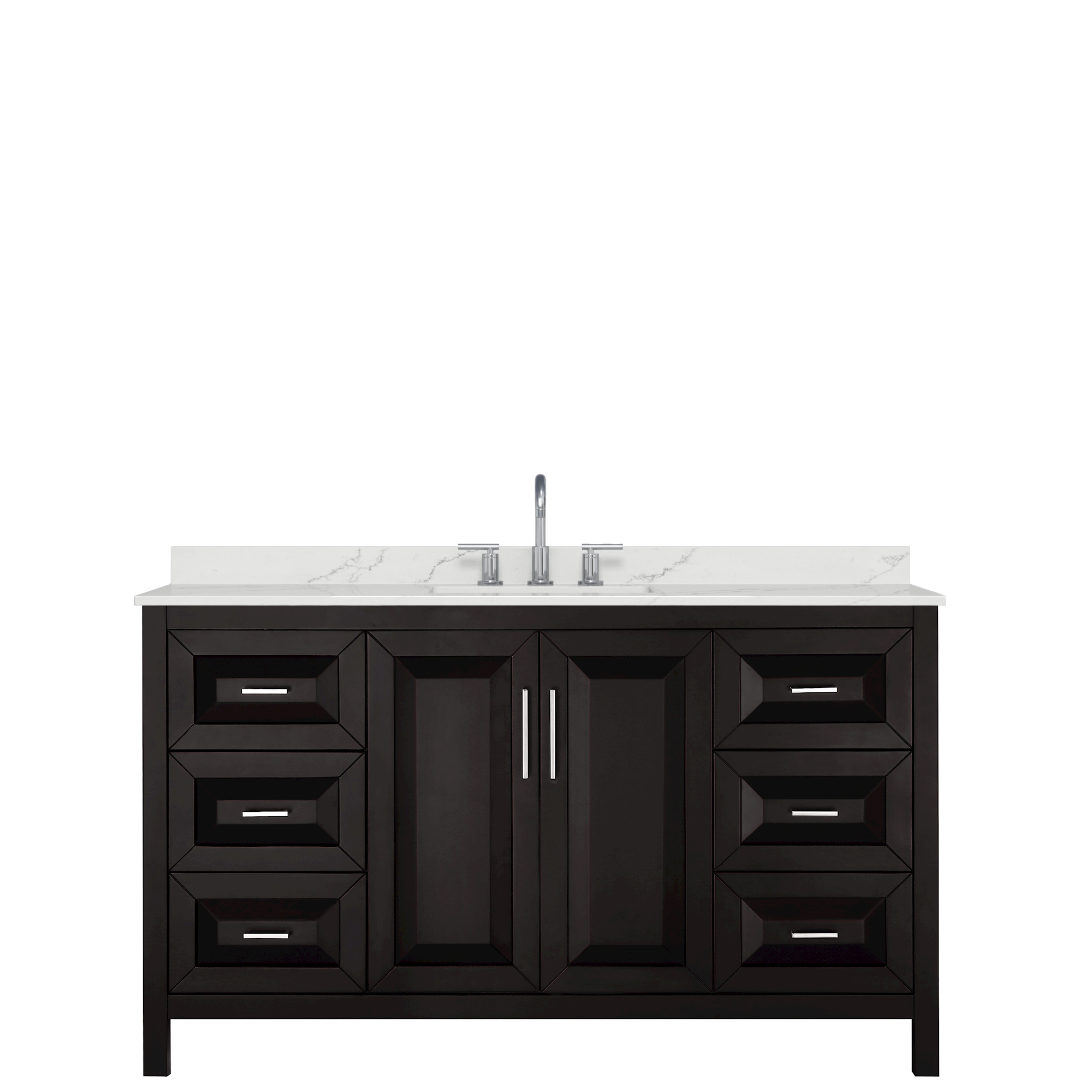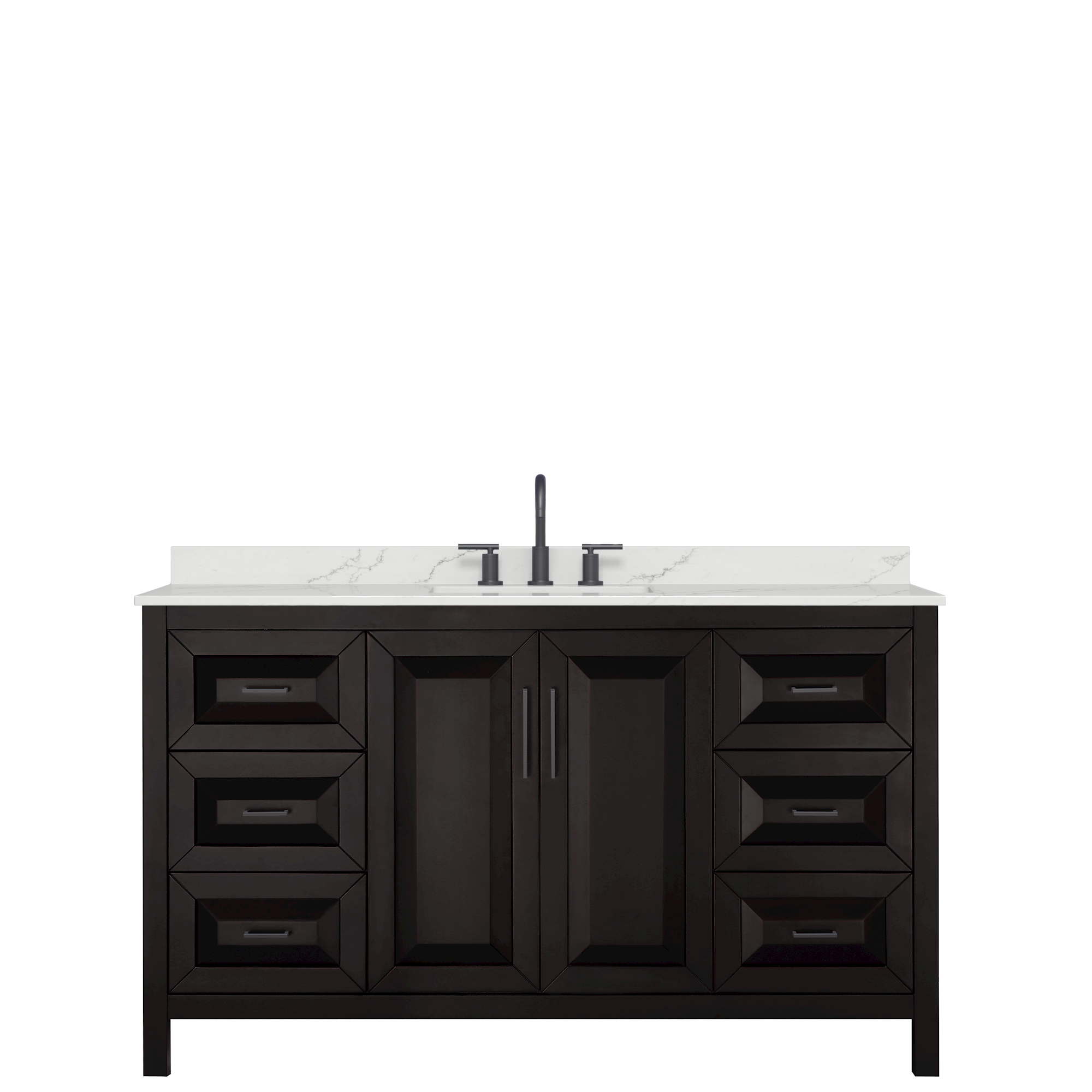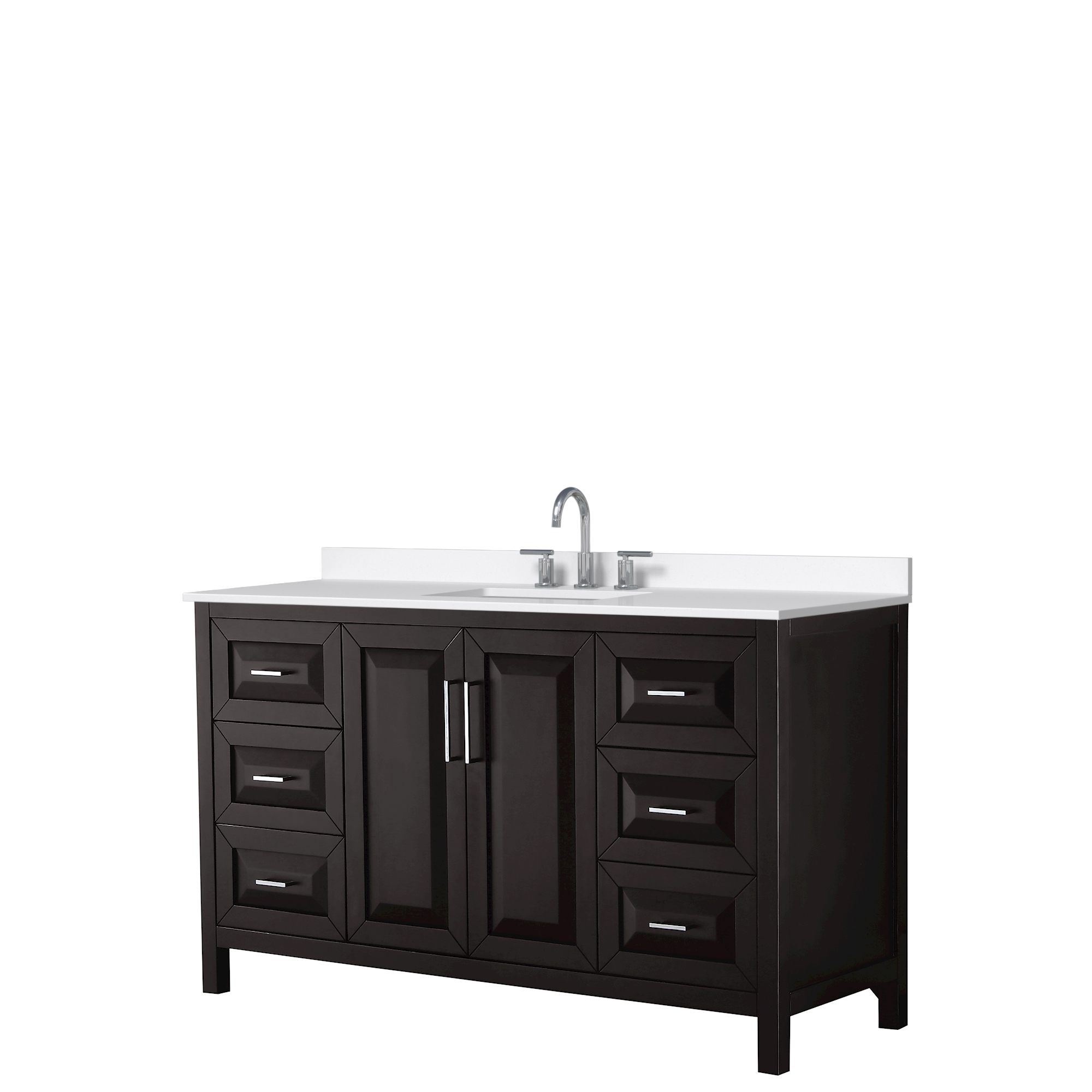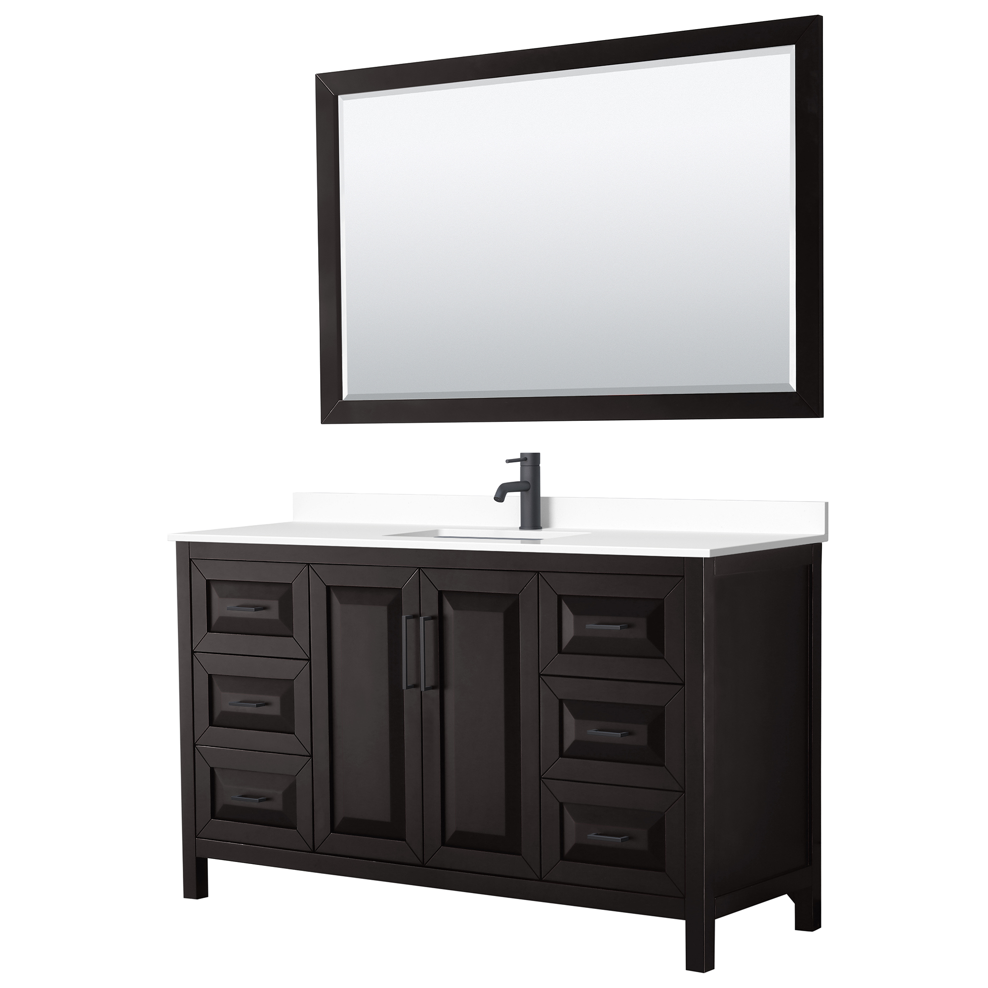 The beautiful Daria collection vanities stand out in any bathroom with strong, clean lines, raised panels and elegant counters with square sinks. There's plenty of cabinet space, the fully extending drawers are dovetail construction, and polished chrome or matte black finish detailing completes the look. Daria vanities deftly combine the function of today with a nod to the elegance of the past. It's the new modern - classic styling with a contemporary twist.