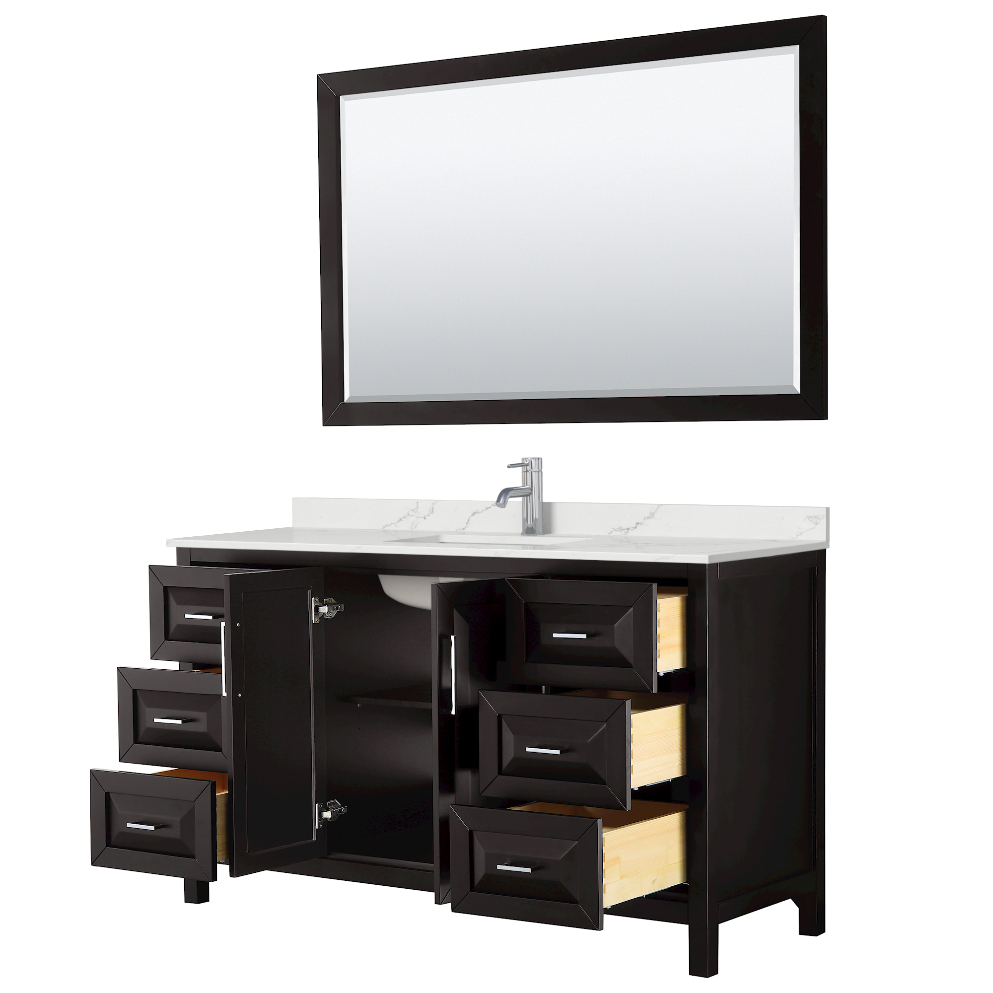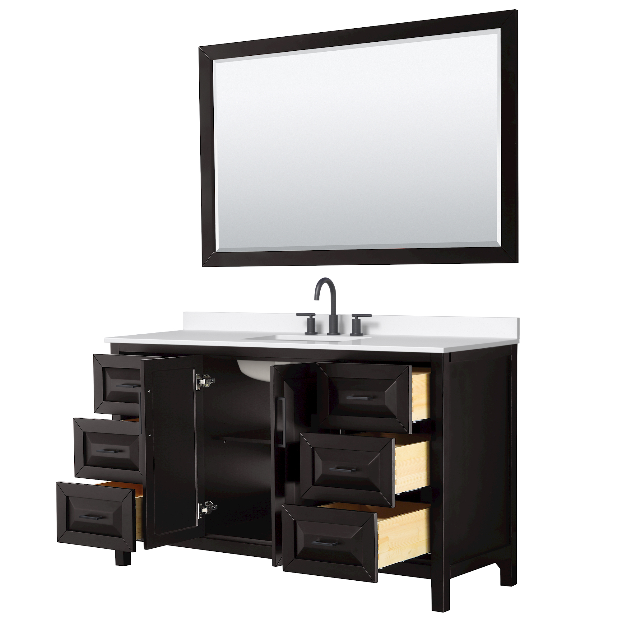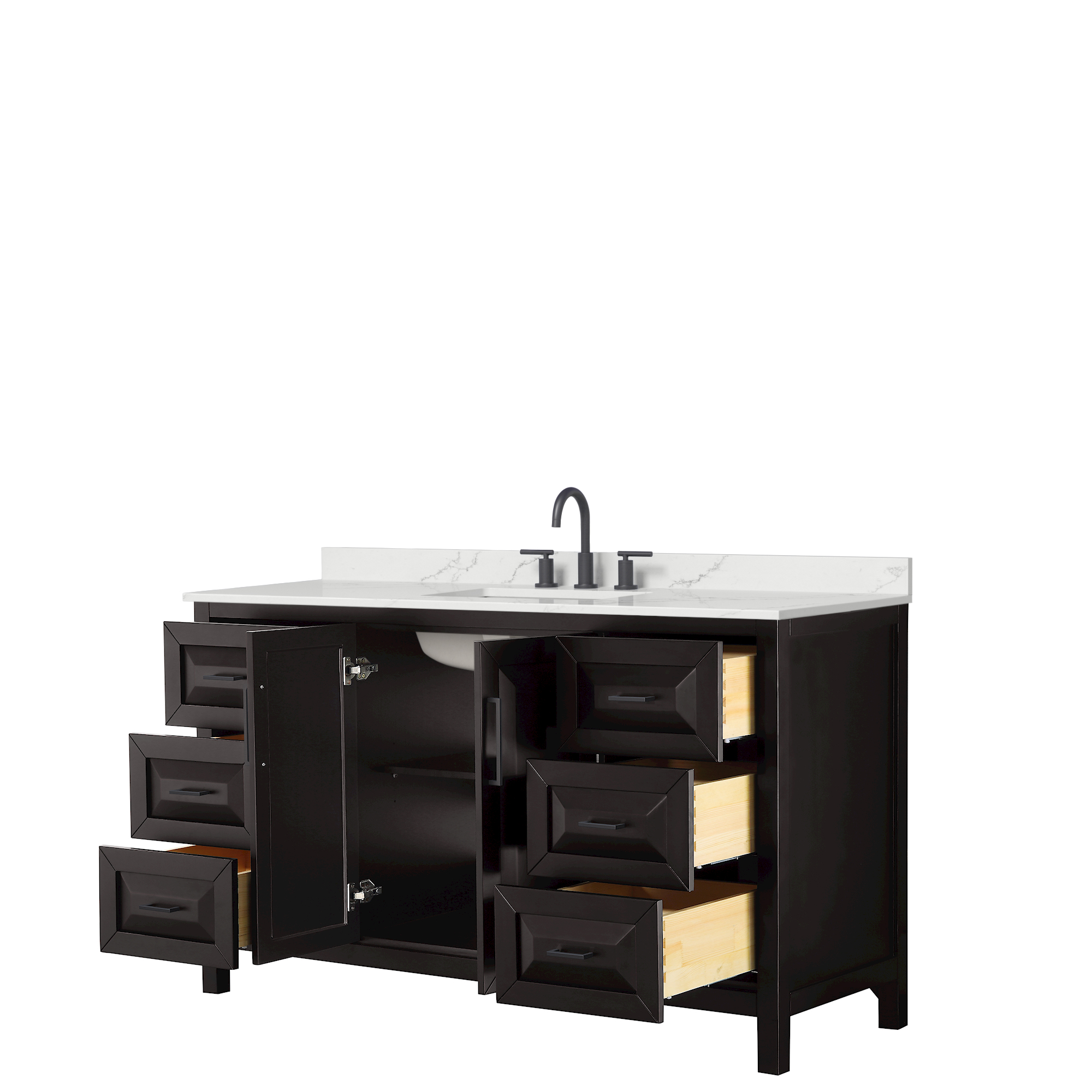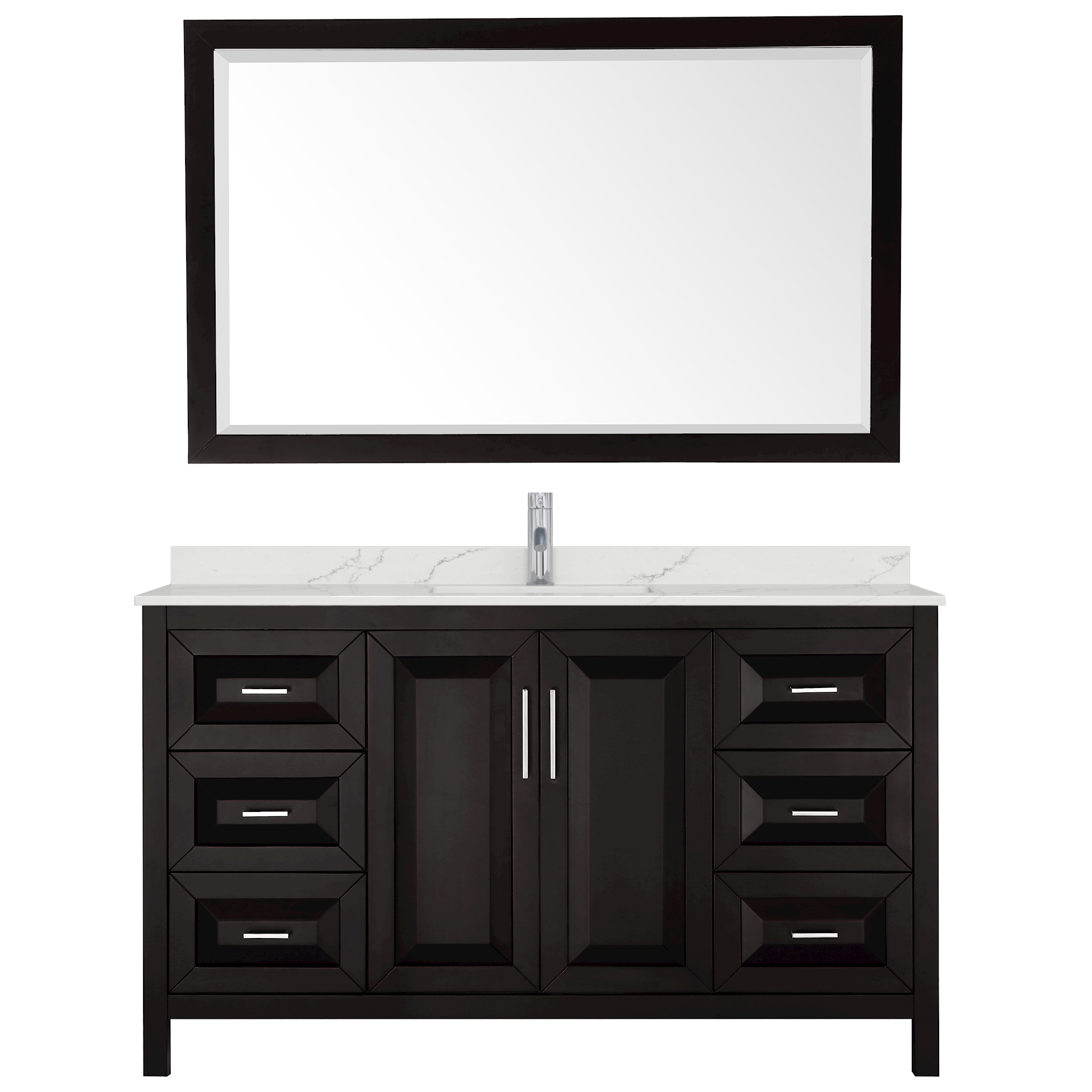 The beautiful Daria collection vanities stand out in any bathroom with strong, clean lines, raised panels and elegant counters with square sinks. There's plenty of cabinet space, the fully extending drawers are dovetail construction, and polished chrome or matte black finish detailing completes the look. Daria vanities deftly combine the function of today with a nod to the elegance of the past. It's the new modern - classic styling with a contemporary twist.