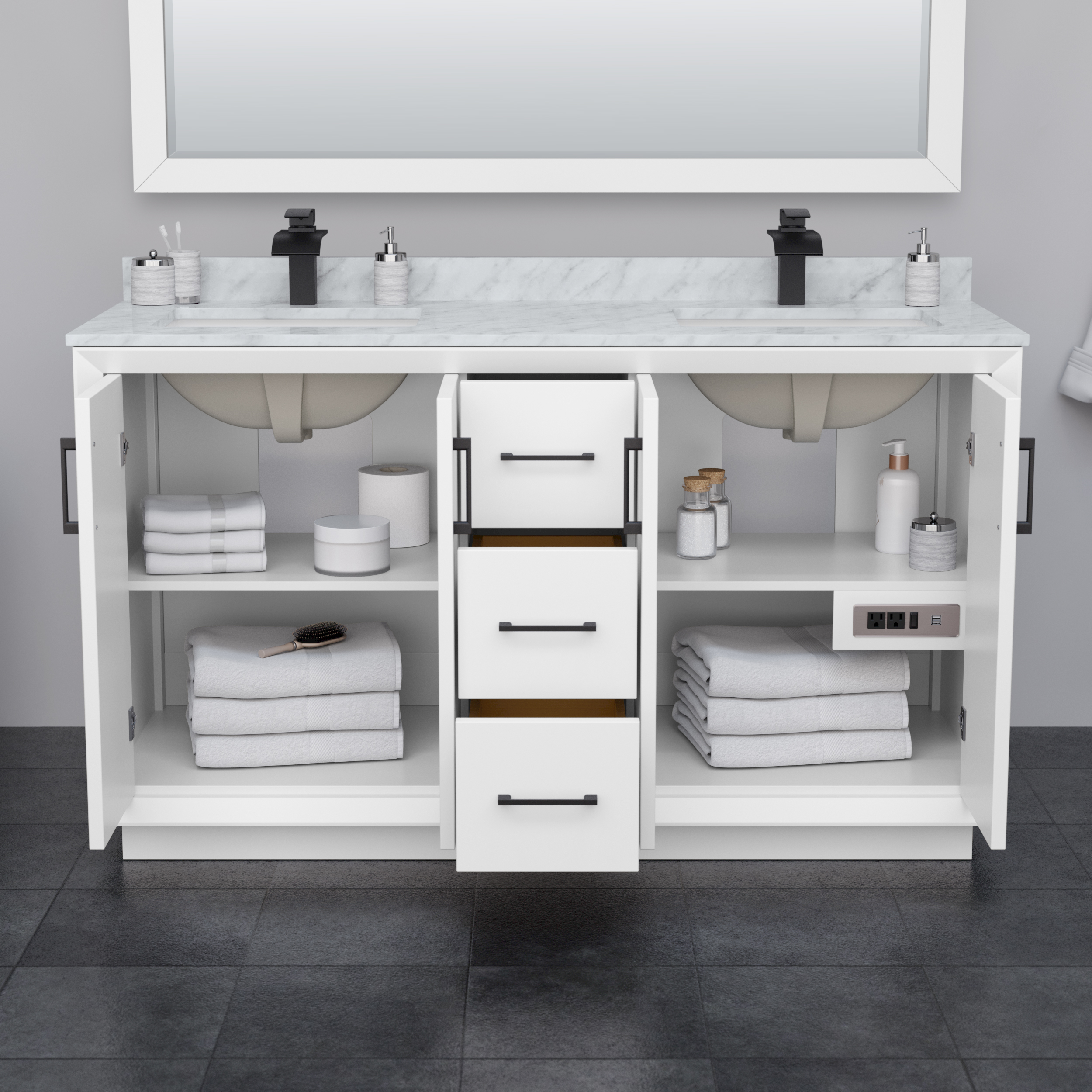 Perfect for a modern update, the Strada bathroom vanity features clean and understated contemporary lines that highlight the elegance and simplicity of this transitional vanity by Wyndham Collection. It comes well equipped with soft-close doors and drawers, ample storage space, 110V power and USB outlets, adjustable shelves, and a cutout back for easy access to plumbing and electrical.