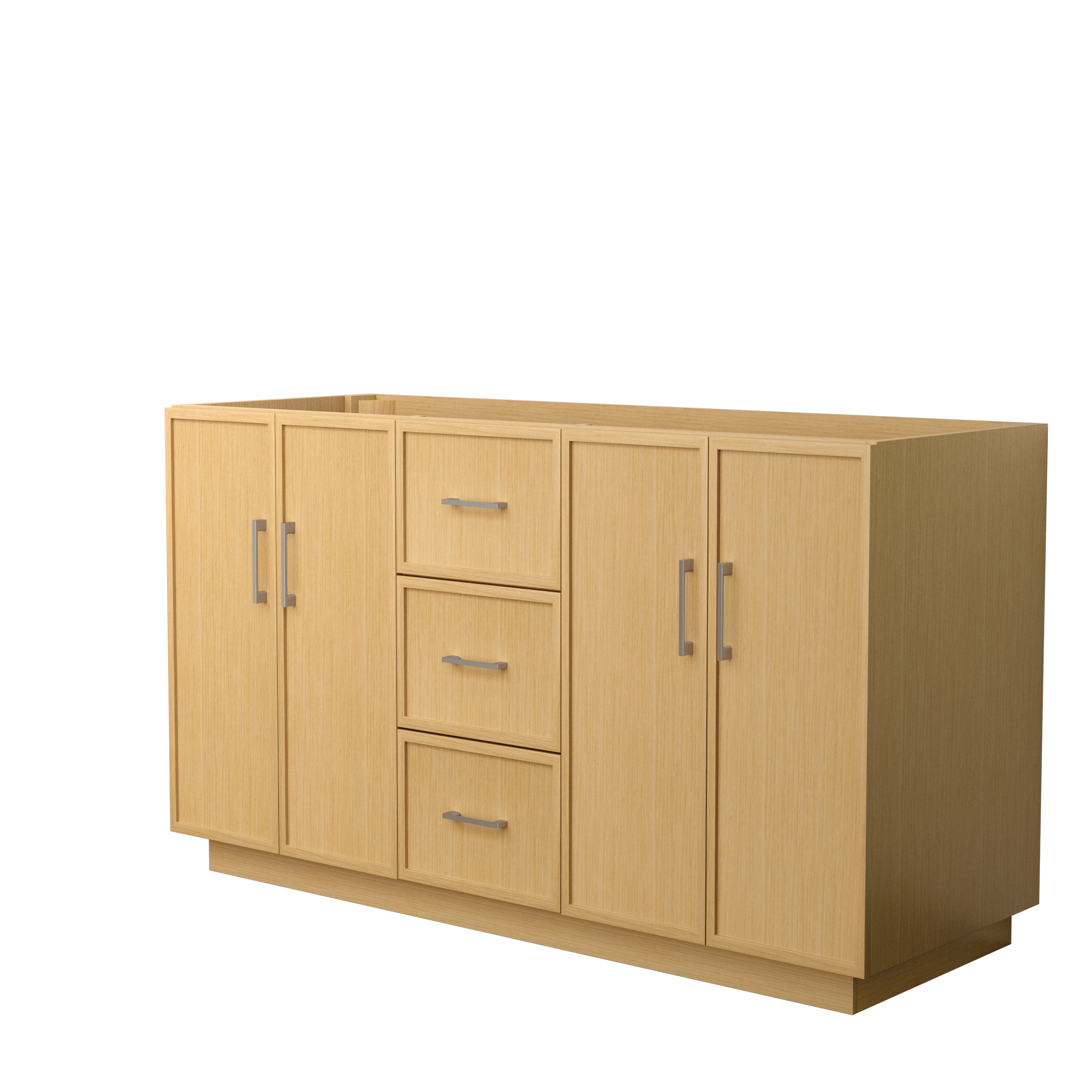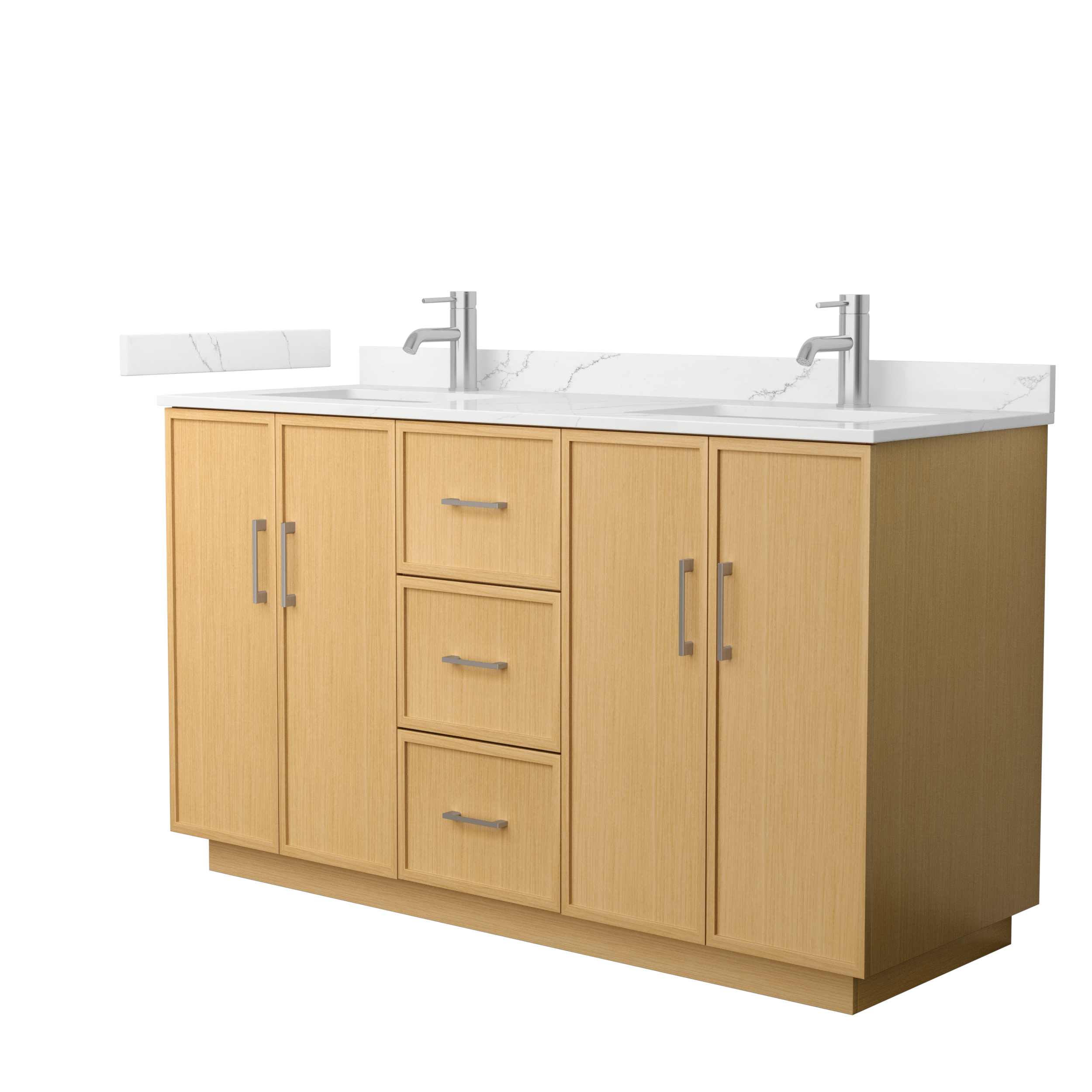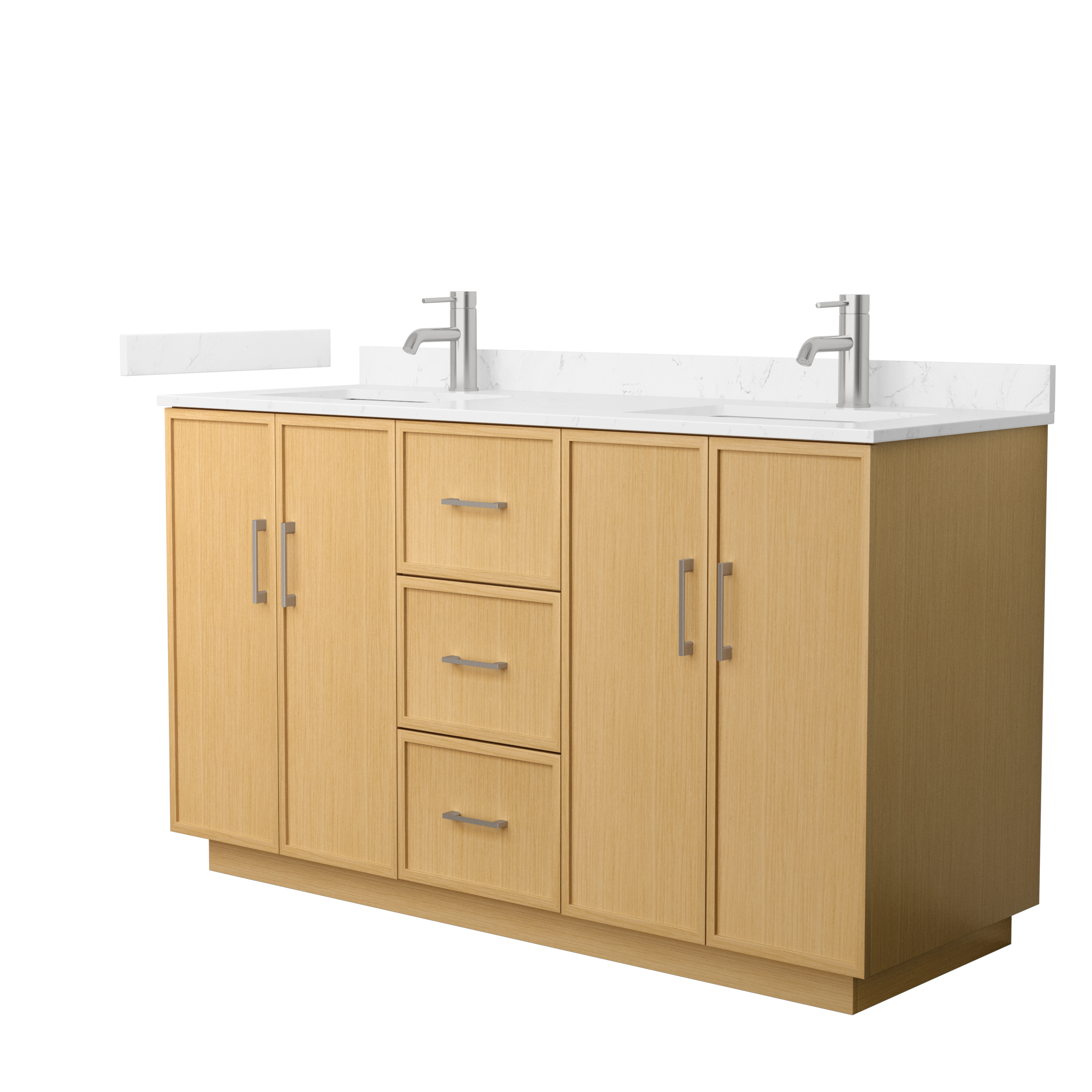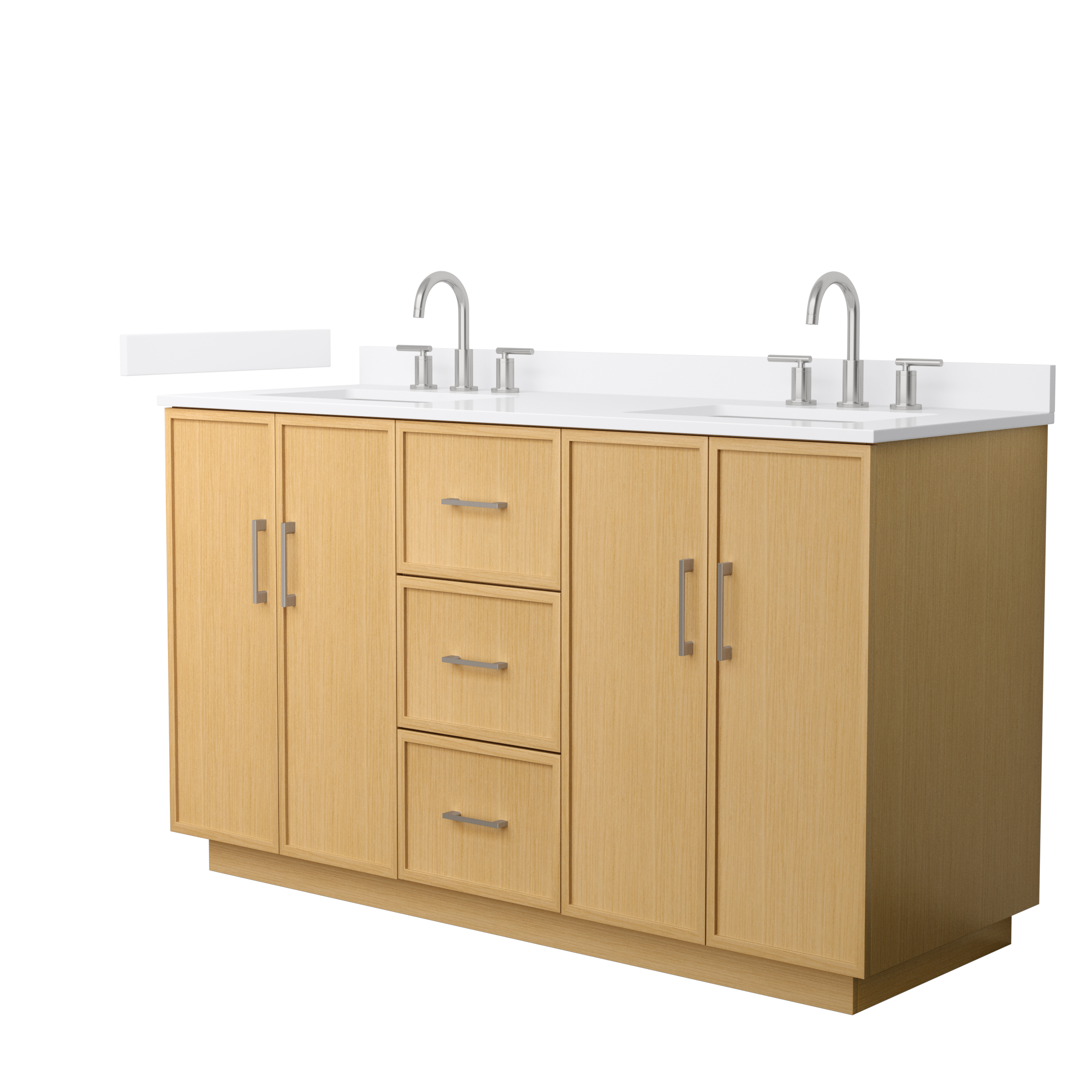 This transitional bathroom vanity exudes sleek sophistication with its clean lines and minimalist slim shaker design. The Elan vanity is crafted from high-quality materials like solid wood and plywood, with counters in multiple material options. Quartz and cultured stone counters include a back-and side-splash. Finished painted or in rift-cut light oak veneer, it seamlessly combines beauty and real-life usefulness. Its integrated, soft-closing drawers (featuring 3D adjustable glides) and doors offer ample storage space for toiletries, towels, and other essentials, keeping the space clutter-free. The sleek, angular hardware contributes to the overall aesthetic, creating a stylish focal point in the bathroom. Elevate your bathroom haven without compromising form or function.