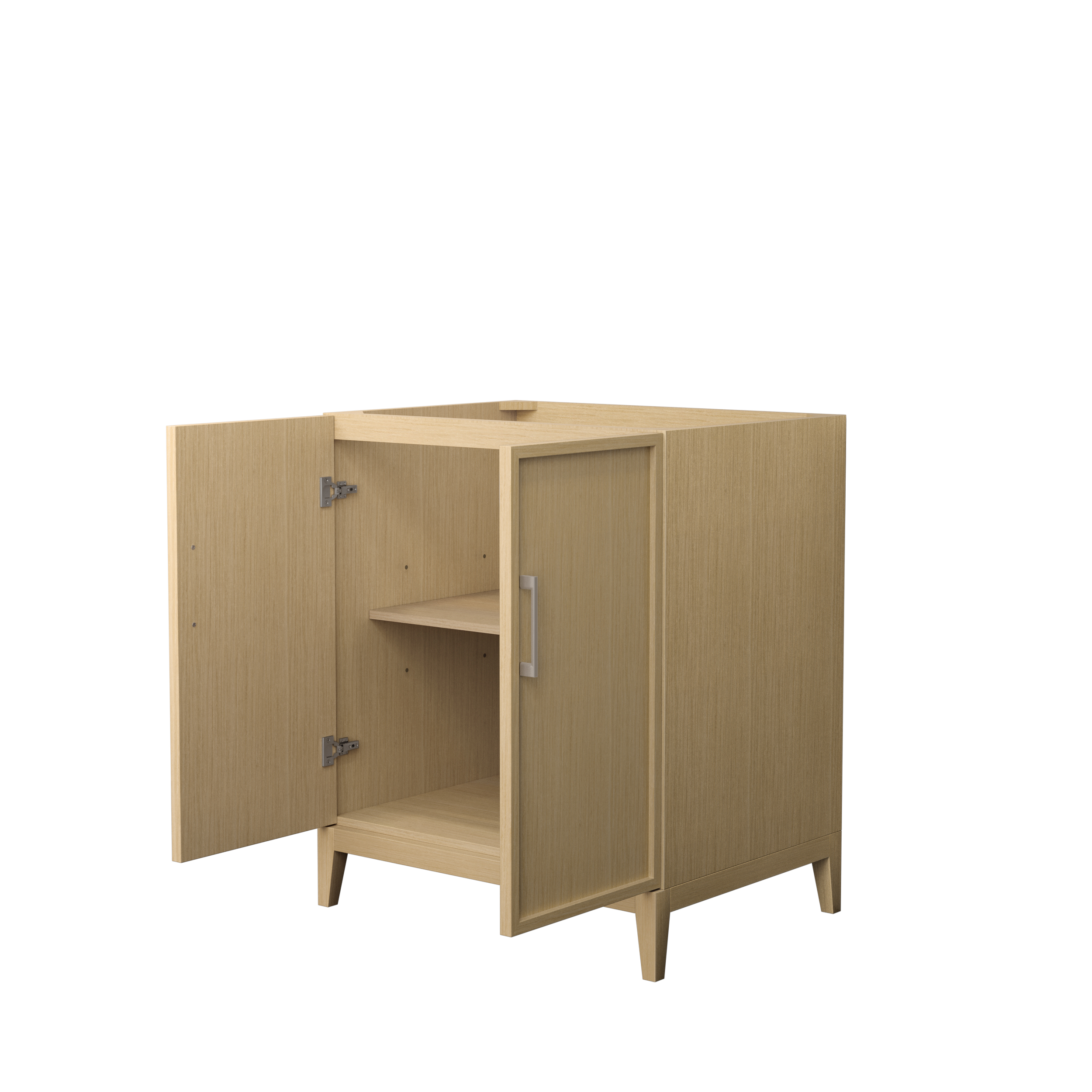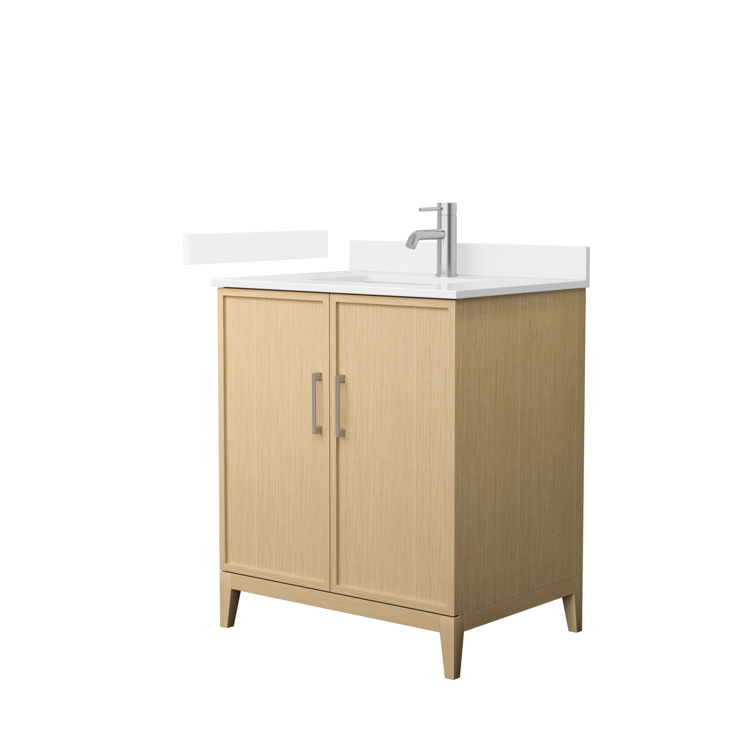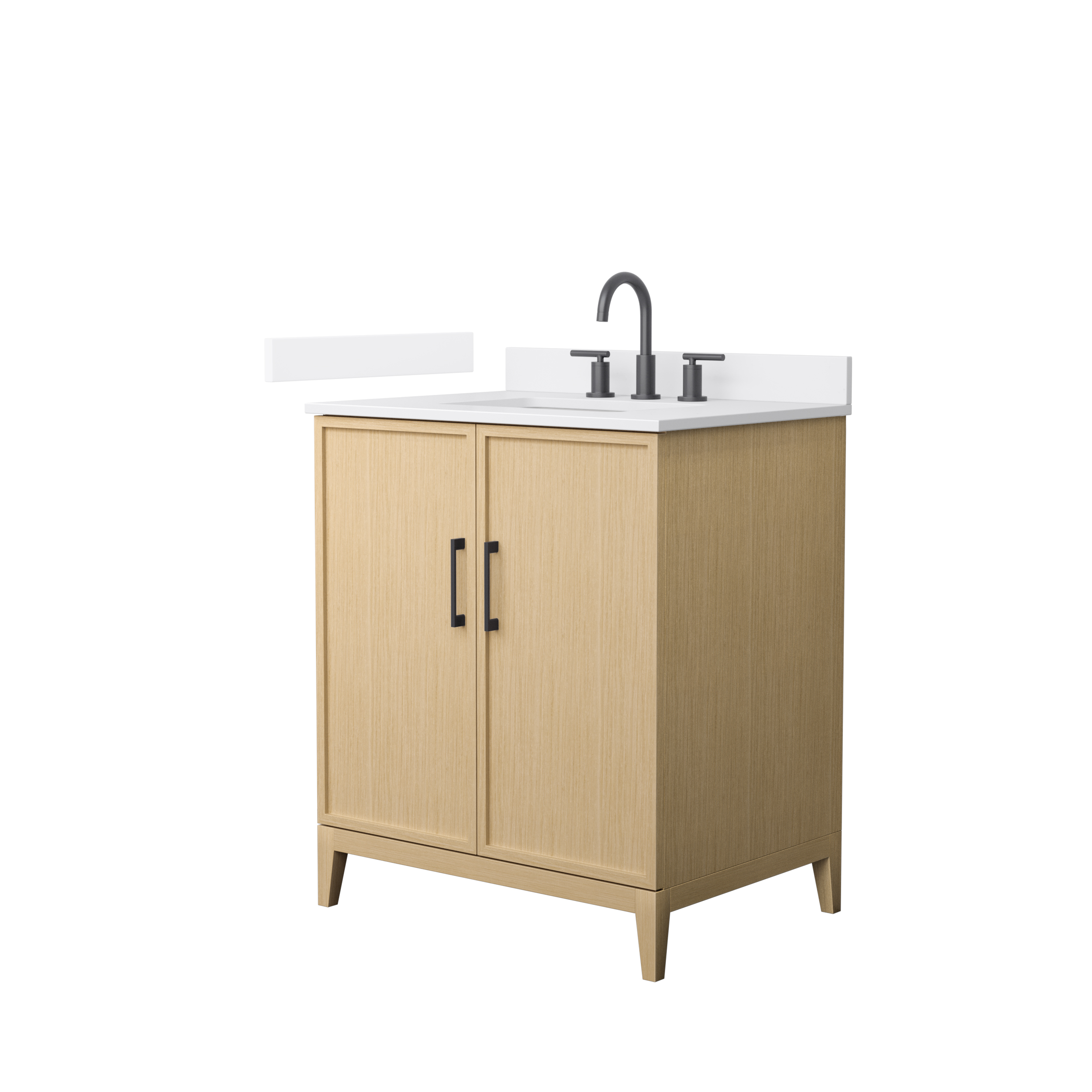 This transitional bathroom vanity exudes sleek sophistication with its clean lines and minimalist slim shaker design. The Elan vanity is crafted from high-quality materials like solid wood and plywood, with counters in multiple material options. Quartz and cultured stone counters include a back-and side-splash. Finished painted or in rift-cut white oak veneer, it seamlessly combines beauty and real-life usefulness. Its integrated, soft-closing drawers (featuring 3D adjustable glides) and doors offer ample storage space for toiletries, towels, and other essentials, keeping the space clutter-free. The sleek, angular hardware contributes to the overall aesthetic, creating a stylish focal point in the bathroom. Elevate your bathroom haven without compromising form or function.