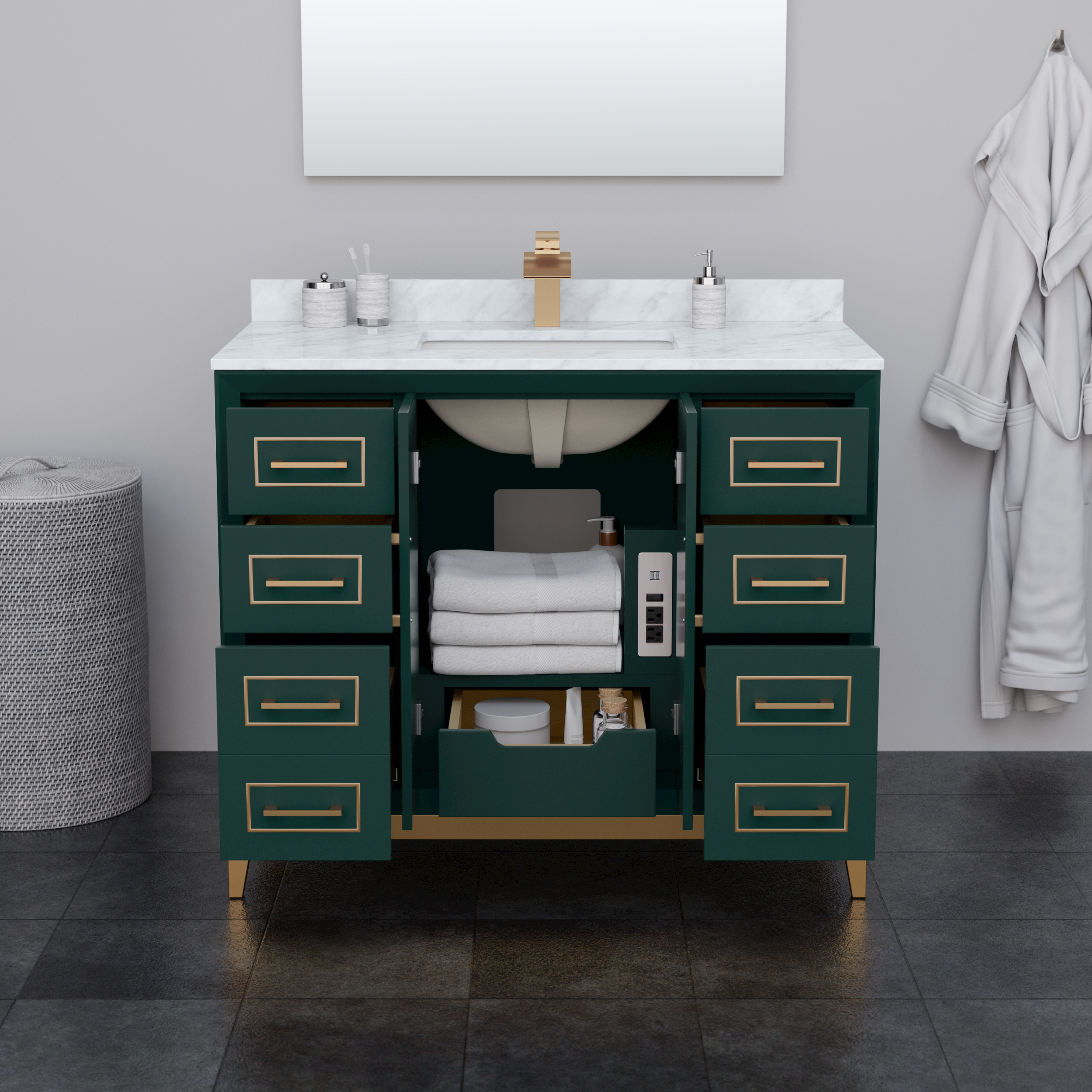 Classic luxurious elegance with clean and contemporary styling are the hallmarks of the beautiful Marlena vanity collection, perfect for most home decors. Offered in a range of sizes, cabinet colors and metal trim colors, you're sure to find the perfect fit. There's plenty of storage space, soft-close doors and drawers, internal drawers and the convenience of a 110v outlet and USB charger just inside the door. Offered with available Quartz, Carrara Marble, or Cultured Stone counters.