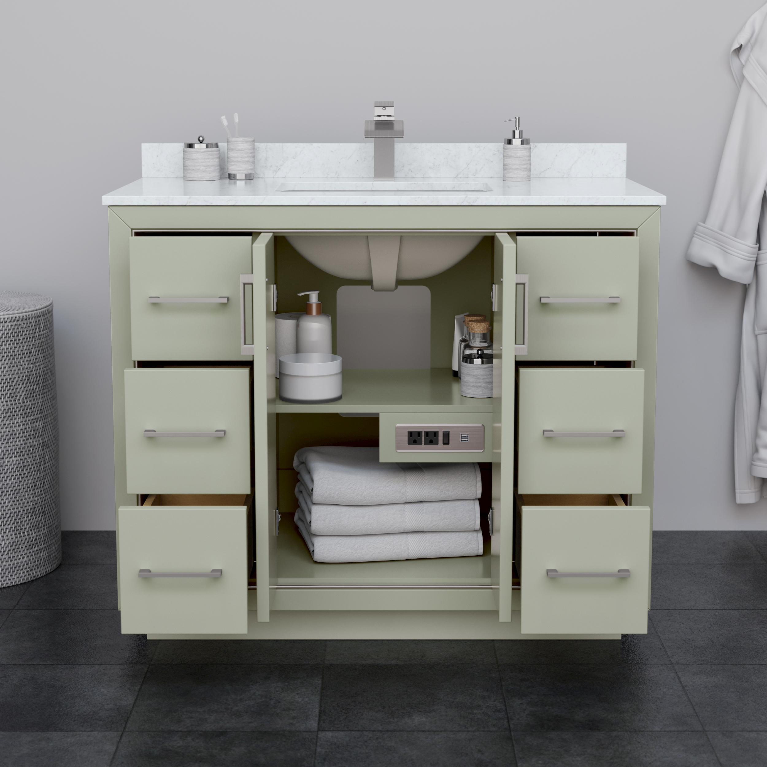 Ideal for the modern home, Icon vanities by Wyndham Collection are a cool, contemporary take on modern bathroom design, an exercise in elegance and style. Beautiful inset metal trim accents this stunning collection, which offers many choices and sizes of vanity and trim color to suit your taste. Interior details feature a power outlet with USB ports, adjustable shelves, and a cutout back for easy access to plumbing and electrical. Icon collection is available in multiple sizes and will work with a wide variety of different styles and decors.