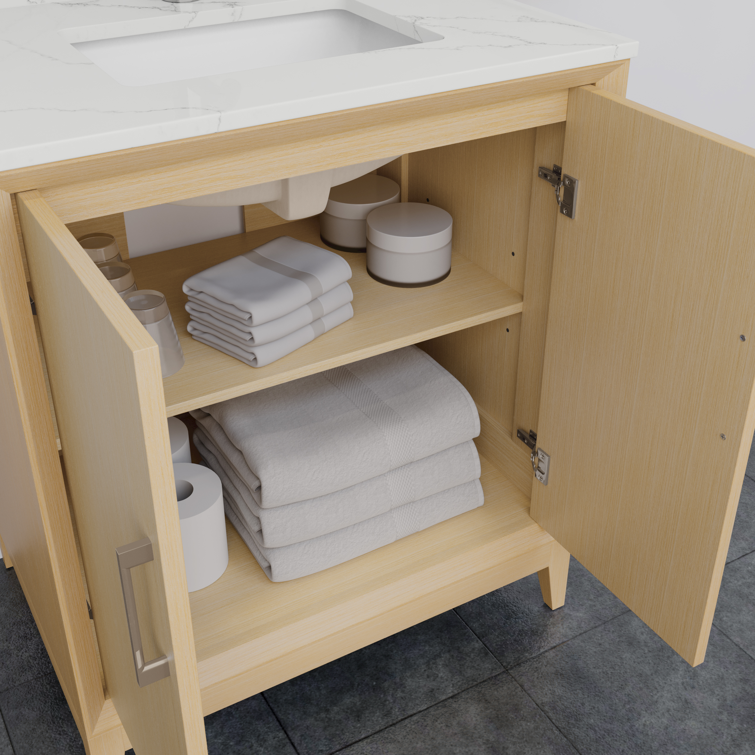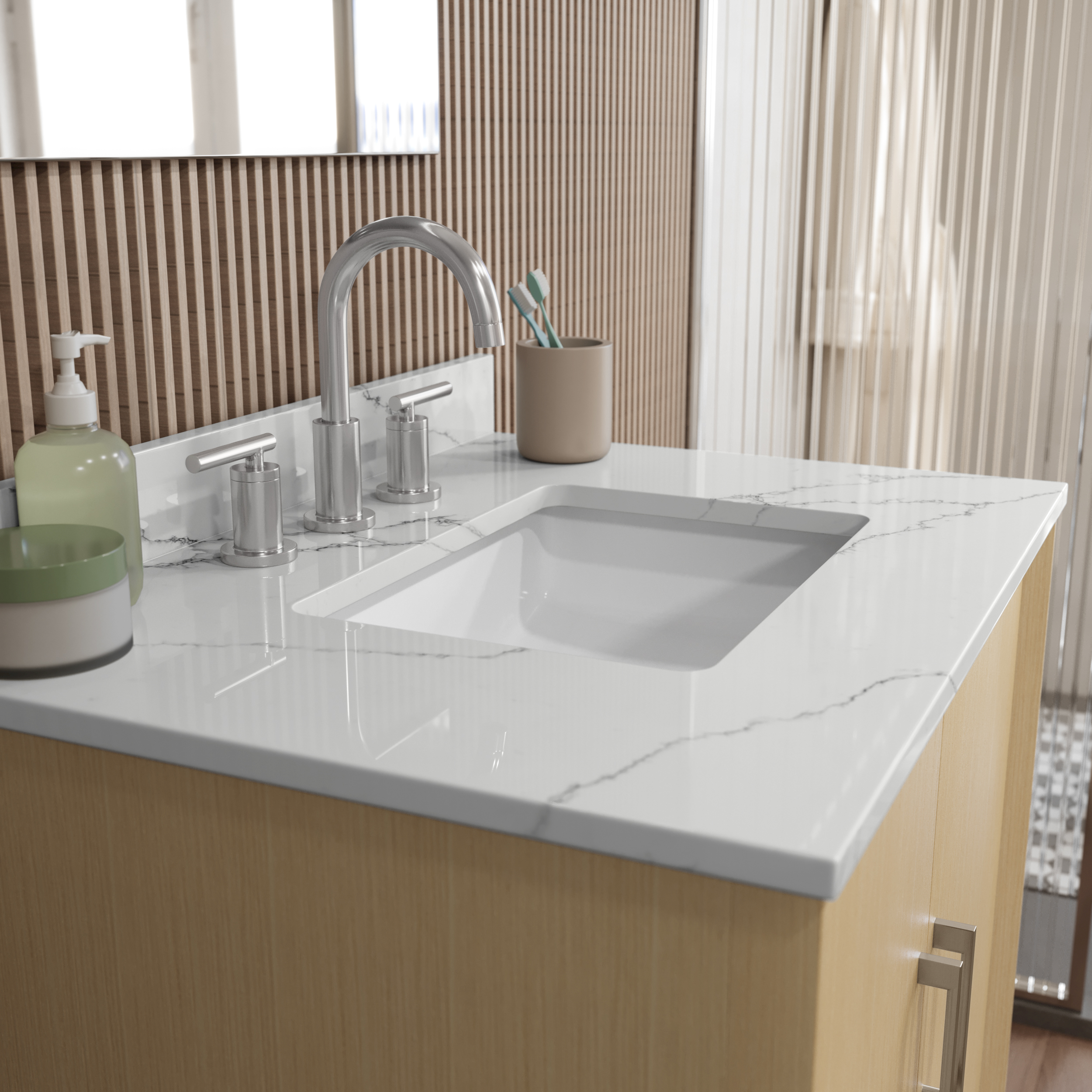 Discover our exquisite line of modern Janna bathroom vanities with natural rift-cut white oak wood veneers to bring warmth and elegance to your space. Each piece showcases the beauty of organic textures while offering practical storage solutions. Perfectly blending contemporary design with natural elements, these vanities create a serene, spa-like atmosphere in any bathroom. Featuring soft close doors and/or drawers in dovetail drawer construction, quality is emphasized to beautiful effect.