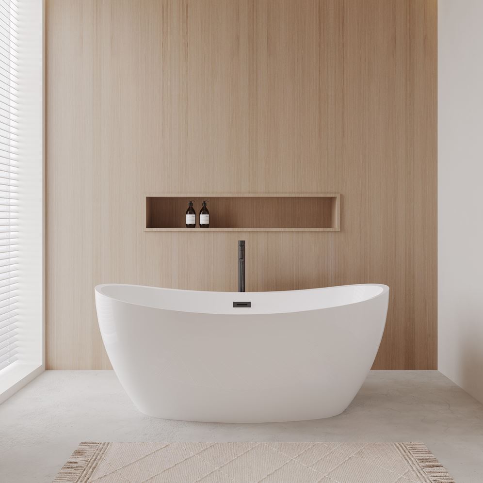 Transform your bathroom into a luxurious spa retreat with this beautiful white acrylic double slipper tub. Designed with gracefully sloped ends, this freestanding bathtub provides the ultimate comfort and support for a relaxing soak. The high-gloss acrylic finish not only adds a touch of elegance but also ensures durability, heat retention and easy maintenance, with a smooth, non-porous surface. Its lightweight yet sturdy construction makes installation simple. This tub is perfect for both classic and modern bathroom designs, making it the ideal centerpiece for unwinding after a long day. Available in 2 sizes and built for a more comfortable and generous bathing experience.